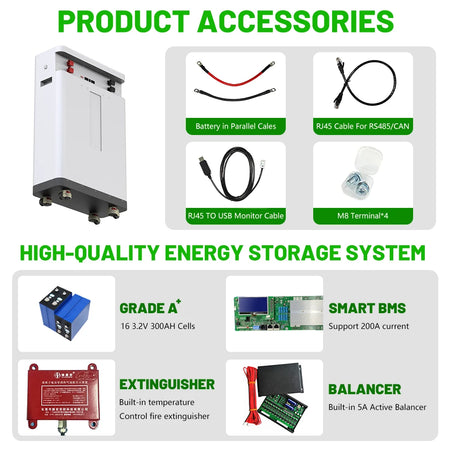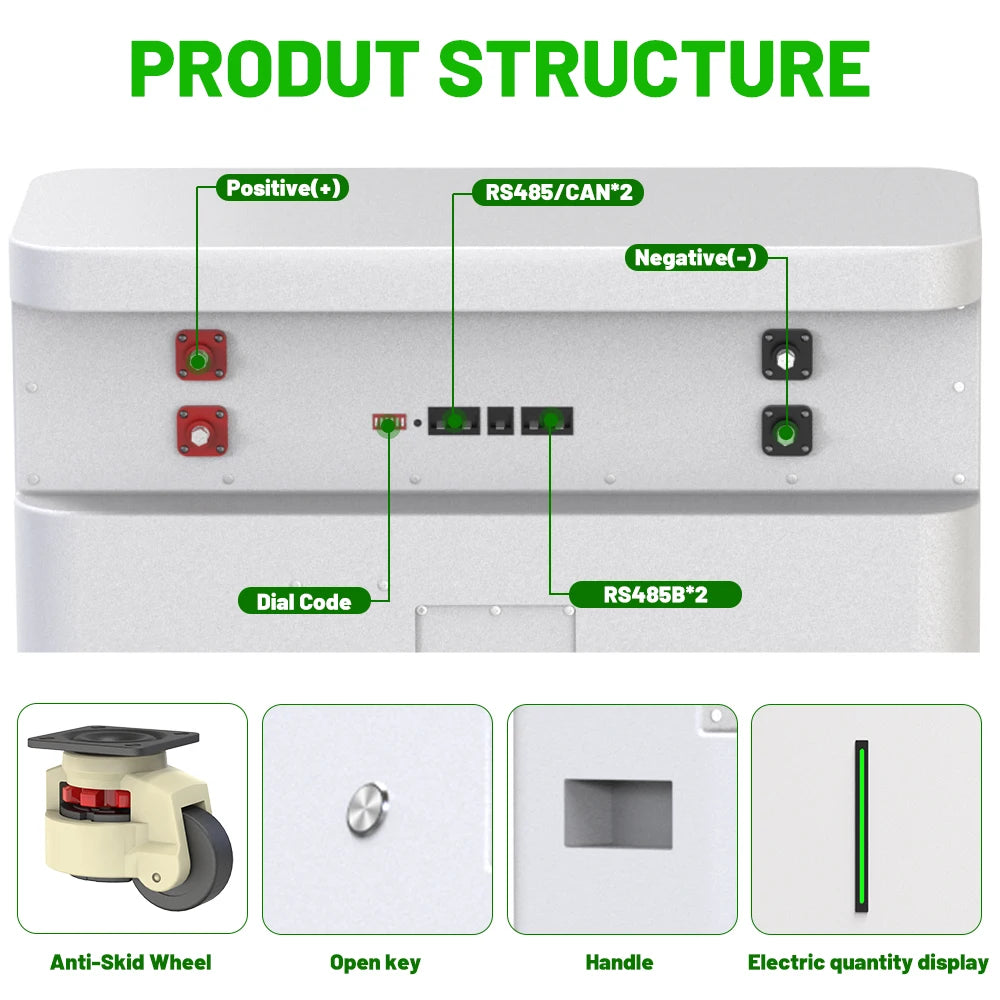 Equipado con un BMS Bluetooth 16S 200A incorporado, esta batería ofrece monitorización y control potentes: lea voltaje, temperatura, estado de carga (SOC), estado de salud (SOH), conteo de ciclos y capacidad por celda. La comunicación CAN/RS485 con inversores asegura una integración fluida con una amplia gama de inversores. El sistema soporta hasta 32 baterías en paralelo, haciéndolo escalable para instalaciones más grandes. Una huella compacta (aproximadamente 530 × 270 × 970 mm) y un peso de alrededor de 130 kg, junto con ruedas universales para facilitar el movimiento, lo convierten en una opción práctica tanto para configuraciones domésticas estacionarias como para aplicaciones móviles.