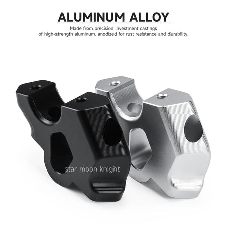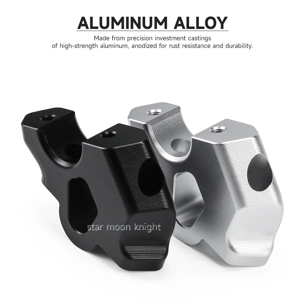 La Abrazadera Elevadora de Manillar de Aluminio Offset Extend para BMW R1300GS 2023 es una mejora de precisión mecanizada por CNC diseñada para aumentar la comodidad y el control en viajes largos. Específicamente hecha para la BMW R1300GS (2023-), este elevador incrementa la altura del manillar aproximadamente 38 mm mientras acerca la base del manillar 27 mm hacia ti. El resultado es una posición de conducción notablemente más erguida y relajada que alivia la presión en la espalda, brazos, columna, pelvis y coxis. Con la fatiga reducida y una vista más clara del camino por delante, disfrutarás de un mejor control y seguridad pasiva en un instante. El diseño asegura una apariencia integrada y sin costuras donde el puente de soporte, el elevador y los manillares parecen una sola pieza. Fabricado en aluminio de alta resistencia y acabado en anodizado plateado, todo el conjunto combina atractivo estético con fiabilidad robusta.