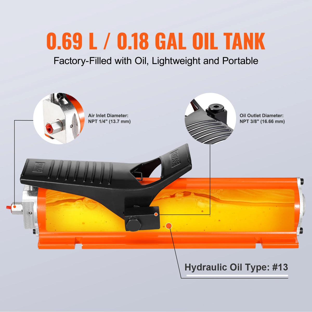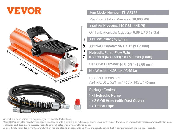 Mejore su taller con la Bomba Hidráulica de Pie de Aire de 10000 PSI (TL-A5122). Diseñada para uso pesado, esta bomba ofrece un soporte hidráulico potente con operación sin esfuerzo. El diseño activado por el pie le permite generar presión rápidamente mientras mantiene las manos libres para un posicionamiento preciso, haciendo que tareas como levantar, prensar y cortar sean más fáciles y seguras. Prellenada con aceite hidráulico (#13) y acompañada de una manguera reforzada larga, proporciona un rendimiento confiable y listo para usar desde el primer momento. Con una salida máxima de 10,000 PSI y un flujo de aire de 340 L/min, experimentará resultados eficientes y consistentes incluso en entornos desafiantes. Construida con aluminio de grado aeroespacial y una carcasa exterior resistente, la bomba resiste impactos y desgaste, mientras que una válvula de alivio interna protege los componentes sensibles para una fiabilidad a largo plazo. La base incluye dos orificios de montaje para una operación firme y sin vibraciones, asegurando estabilidad durante el uso. La configuración rápida es sencilla: abra el respiradero de aire durante cinco minutos antes del primer uso, luego ciérrelo para una operación suave e ininterrumpida.
