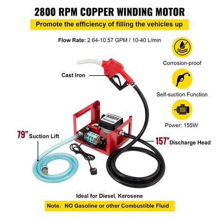 Eficiente, robusta y fácil de usar, la bomba de transferencia de diésel y queroseno de 40 L por minuto está diseñada para transferencias rápidas y confiables de combustible en entornos profesionales o domésticos. Construida con una carcasa duradera de hierro fundido y un motor de cobre de 155W, ofrece un rendimiento constante para aplicaciones de diésel y queroseno. La bomba cuenta con succión automática y una boquilla de llenado con parada automática, ayudándote a llenar tanques rápidamente mientras reduce derrames y riesgos de sobrellenado. Con un medidor de combustible incorporado y detalles de diseño prácticos, esta bomba hace que las transferencias en sitio sean más limpias y eficientes.