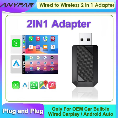 Disfruta de la libertad inalámbrica en tu coche con el adaptador ANYFAR 2-en-1 para CarPlay inalámbrico y Android Auto. Este compacto dispositivo USB conecta el sistema de infoentretenimiento por cable de tu coche a CarPlay inalámbrico y Android Auto inalámbrico, permitiéndote usar mapas, mensajes y asistentes de voz sin el enredo de cables. Es la solución práctica y fácil de usar que simplifica cada viaje mientras preserva la fiabilidad de tu sistema de fábrica.
