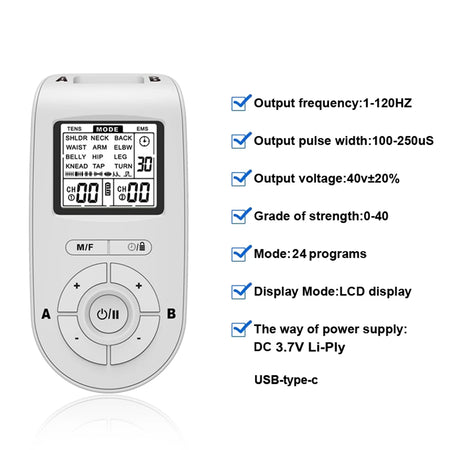 TENS EMS füsioteraapia massaažiseade 40 reguleeritava tasemega, 24 režiimiga