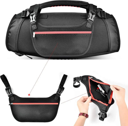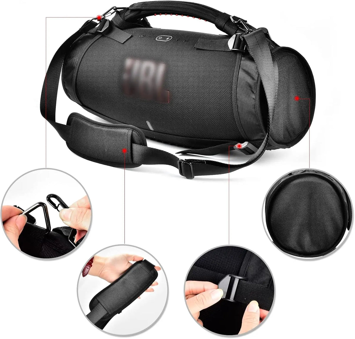 Kott on valmistatud vastupidavast polüestrist igapäevaseks kasutamiseks ja sisaldab tarvikute taskut laadija, AC toitekaabli ja teie mobiiltelefoni hoidmiseks, et olulised osad oleksid koos ja kergesti leitavad. Reguleeritav vöö ühendab võrkpaneelid kõlari ümber, et tagada kindel ja tihe istuvus, samas kui sisseehitatud käepide ja reguleeritav õlavöö pakuvad paindlikke kandmisvõimalusi. Kui kotti ei kasutata, volditakse see kompaktselt lihtsaks ladustamiseks, sobides kenasti seljakotti või auto konsooli.