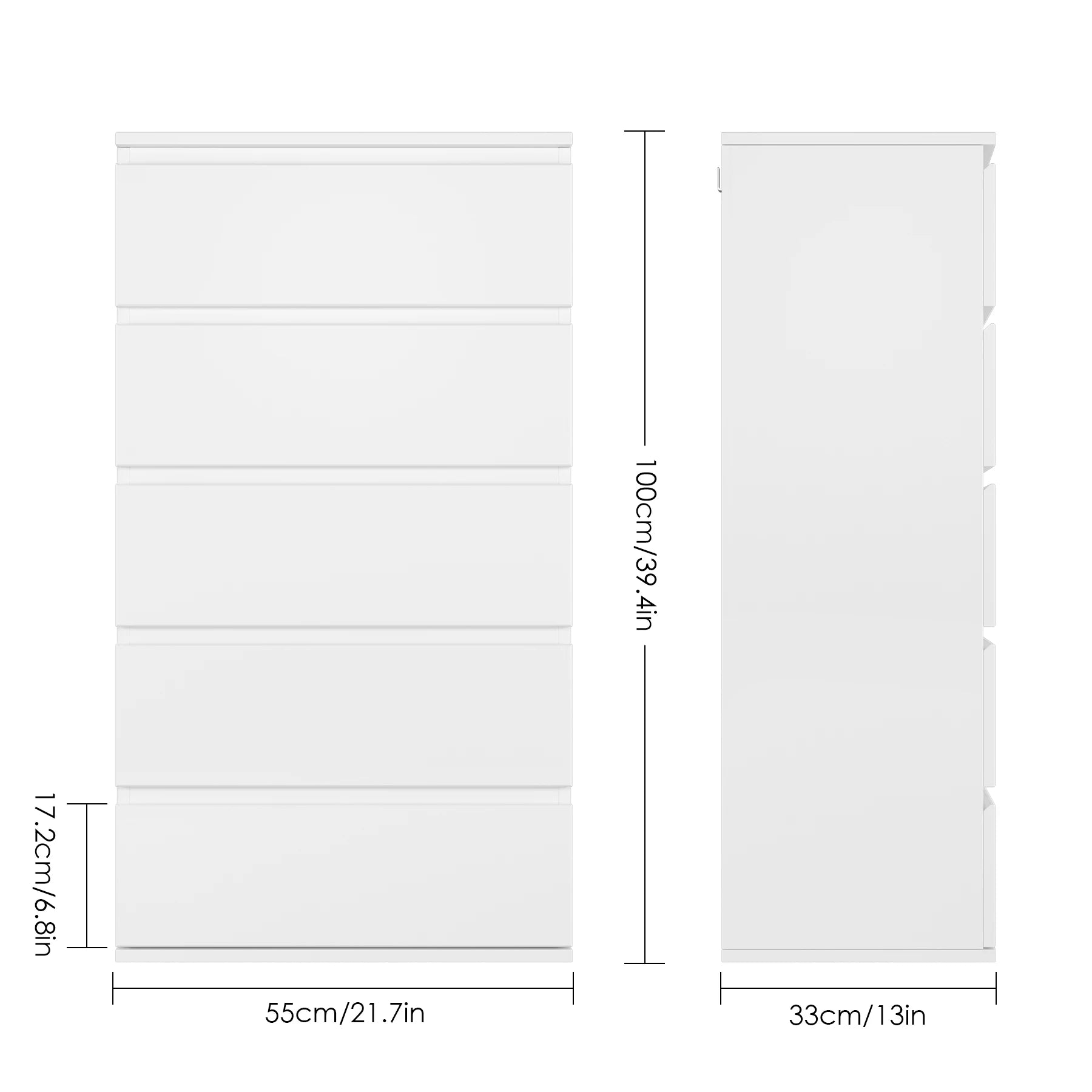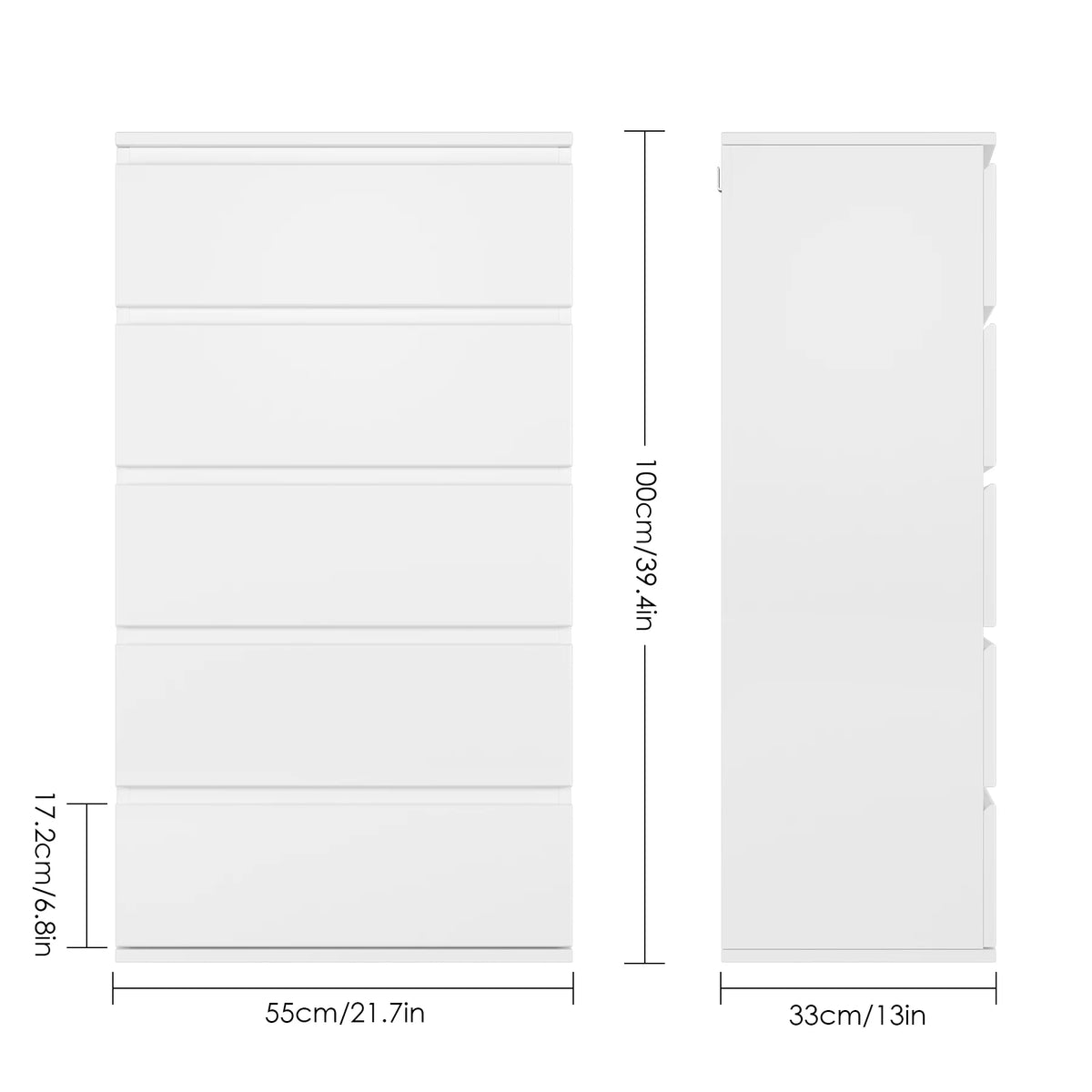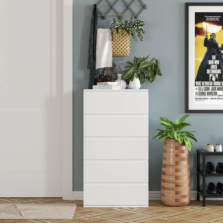 Tutvuge Getone White Tall 5 Drawer Chest of Drawers for Bedroom'iga, kompaktse, kuid avara ladustamislahendusega, mis on loodud kaasaegseks eluks. Valge viimistlusega, lihtsate ja puhaste joontega, toob see kummut igasse ruumi rahuliku ja organiseeritud tunde, hoides samal ajal teie igapäevased esemed kenasti ära peidetud. Selle minimalistlik kaasaegne stiil sobib ideaalselt magamistuppa, elutuppa, koridori või tööruumidesse.