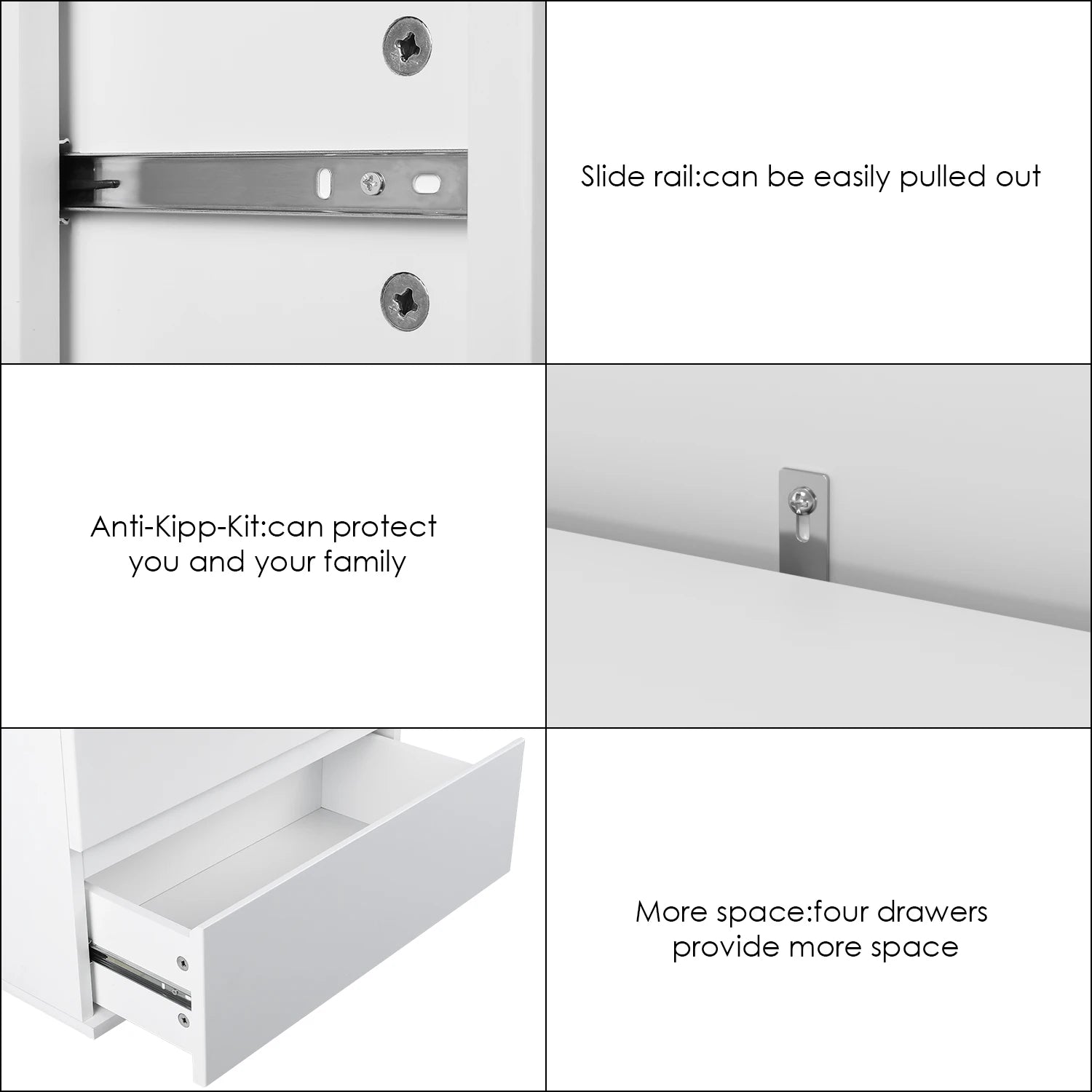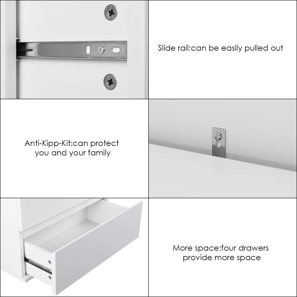 Hoolikalt konstrueeritud kvaliteetsetest MDF-paneelidest valmistatud kummut on vastupidav ja vaikse välimusega, säilitades puhta välimuse isegi suure liiklusega aladel. Valge korpus ja voolujooneline siluett loovad kerge ja õhulise atmosfääri, mis täiendab erinevaid sisustusi ja värviskeeme.