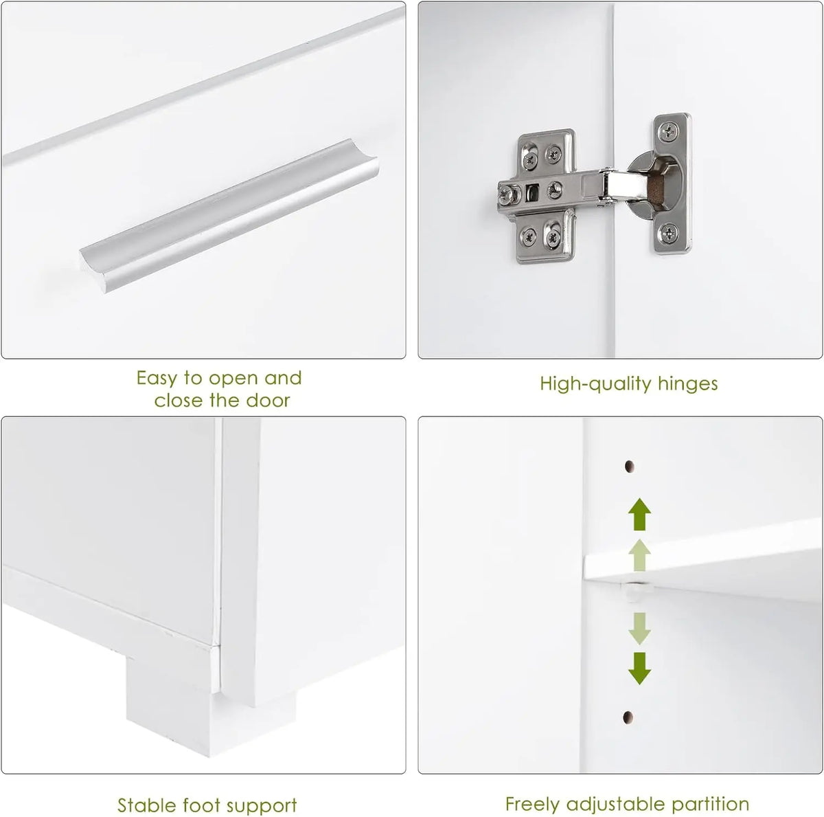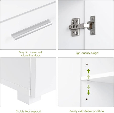 Kahe uksega kapp on hoolikalt jagatud reguleeritava riiuliga uste taga, andes teile kaks eraldi hoiuruumi ja paindlikkuse mahutada erineva kõrgusega esemeid. Puhas valge viimistlus lisab värske ja kaasaegse puudutuse igasse vannituppa, samas kui reguleeritav vahesein aitab maksimeerida ruumi pudelite, pintslite ja puhastusvahendite jaoks.
