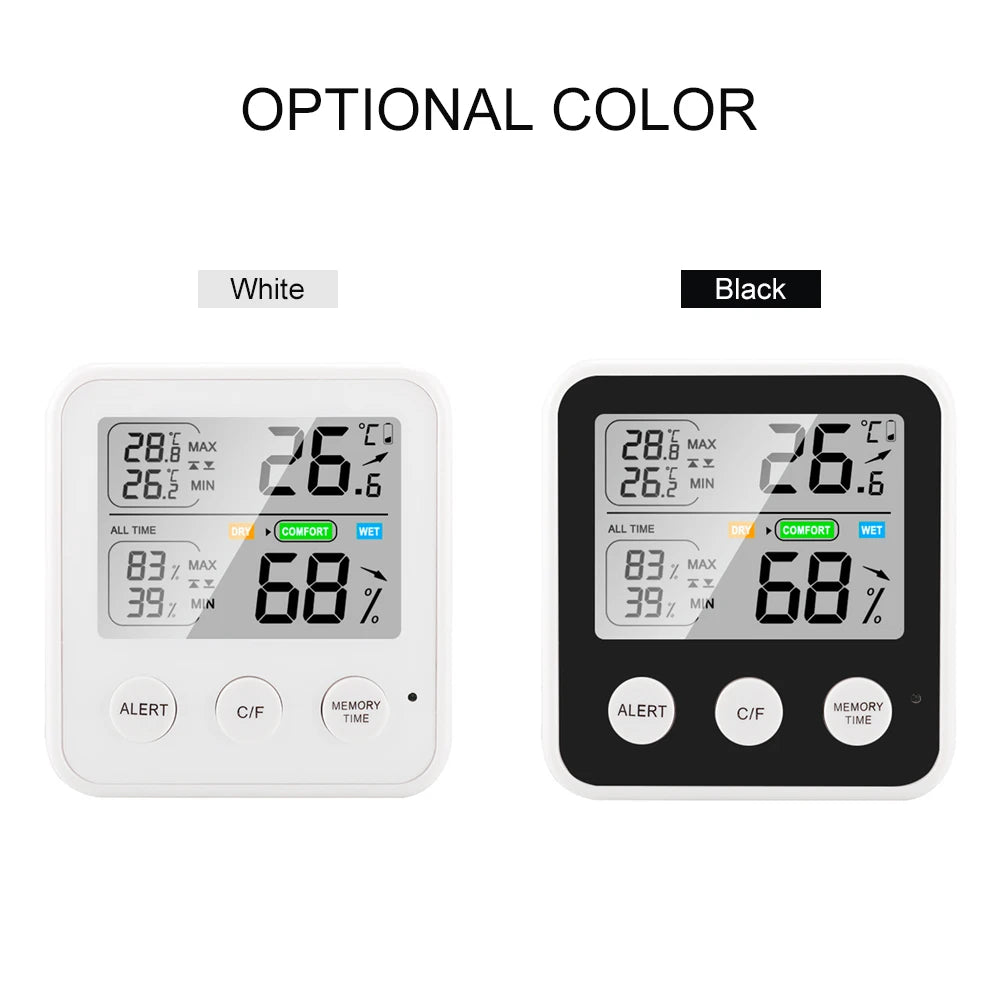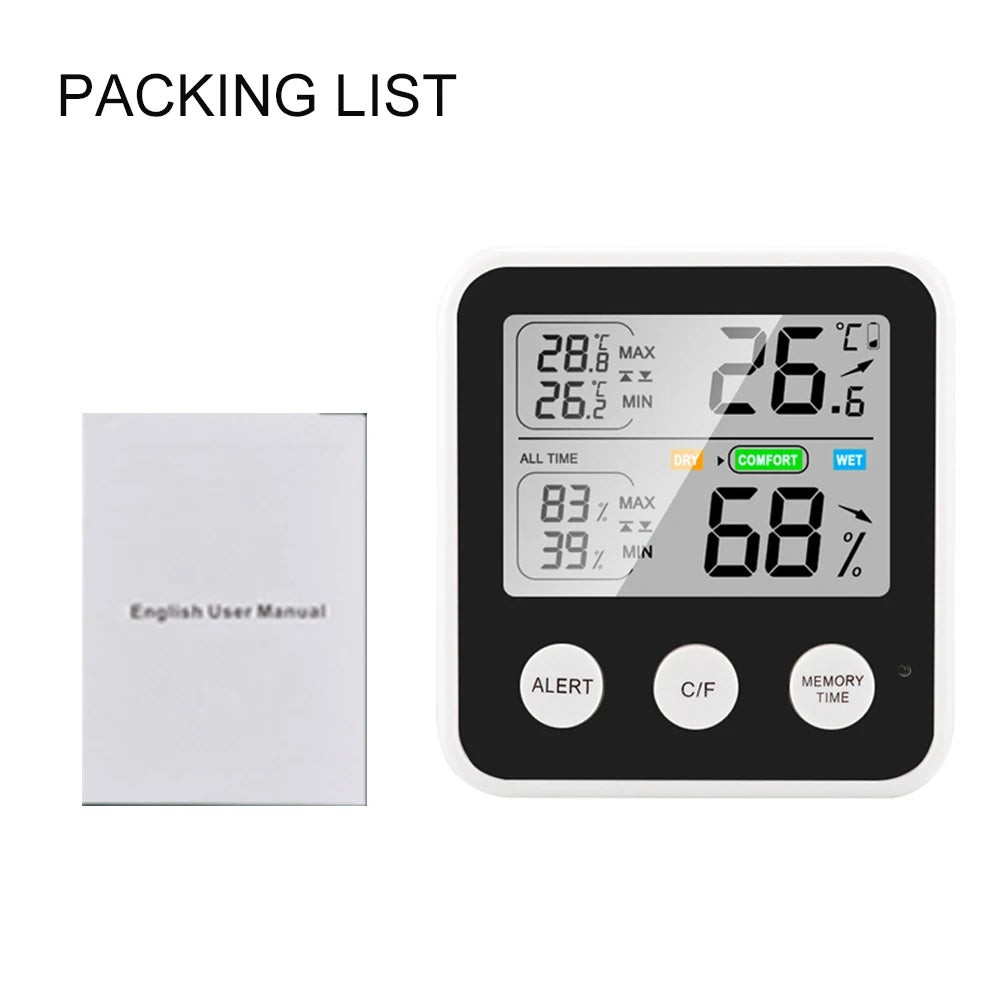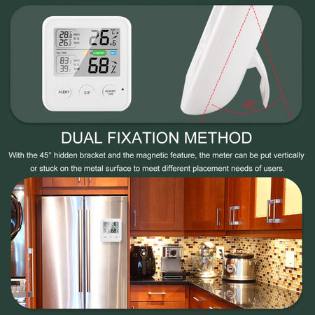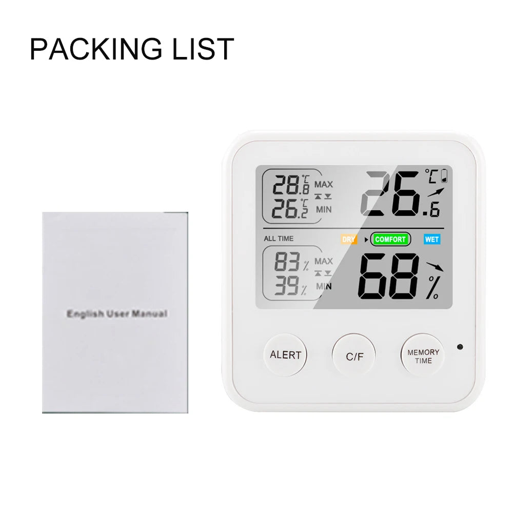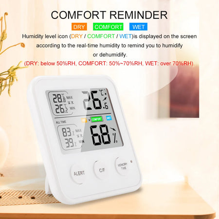 Valmistatud kvaliteetsest ABS-materjalist, kest jääb vastupidavaks ja ei kollase aja jooksul. See usaldusväärne seade mitte ainult ei näita reaalajas väärtusi, vaid salvestab ka maksimaalsed ja minimaalsed näidud 24 tunni jooksul, andes teile selge suuna otse ekraanil. Kui näidud ületavad teie seadistatud piirid, annab seade helisignaali ja valgushoiatuse, et hoida teid teavitatud viivitamatult. Mugavuse meeldetuletuse ikoon näitab KUIVA, MUGAV või NIISKE seisundit, et saaksite kiiresti tegutseda niiskuse suurendamiseks või vähendamiseks vastavalt vajadusele.