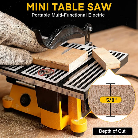 Tutvuge Compact 90W Mini Lauasaega—portatiivne, kõrge efektiivsusega tööriist, mis on mõeldud täpsete lõikude tegemiseks puidus, alumiiniumis ja muus. 90-vatine AC mootor toidab seda, saavutades kuni 4500 p/min, et kiiresti läbi viia väikseid DIY projekte ja delikaatseid käsitöid usaldusväärse täpsusega. See kompaktne saag tuleb koos kolme 4-tollise lõikeplaadiga ja maksimaalse lõikesügavusega 5/8 tolli, võimaldades lihtsat tööd vase, alumiiniumi, raua, roostevaba terase, samuti klaasi, plaatide ja kivi peal. Kaldjuhiku raud võimaldab teil kiiresti reguleerida horisontaalset lõike nurka täpsete nurklõikude jaoks, samas kui sakiline tööpinna pind takistab libisemist stabiilsete tulemuste saavutamiseks. Ohutust silmas pidades on sellel kaarjas ventilatsiooniport ja ülekoormuskaitse, et vähendada kuumenemist ja pikendada eluiga, pluss lõikekaitse seade meelerahu tagamiseks. Seade on kompaktne ja portatiivne, mõõtmetega 7,5 tolli pikk, 5,5 tolli lai ja 4,7 tolli kõrge, nelja kummipadjaga, et minimeerida libisemist, vibratsiooni ja müra. See on EU pistikuga ühilduv ja sisaldab akut mugavaks juhtmevabaks kasutamiseks.