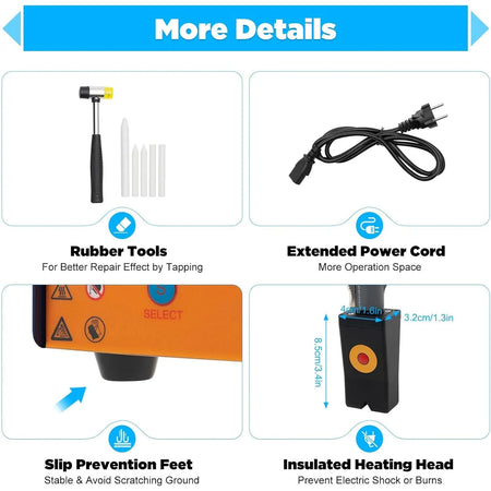 Selle kasutusmugavuse võti on digitaalne ekraan, millel on reguleeritav parandusaeg ja võimsus, andes teile täpse kontrolli kuumutamisprotsessi üle. Seade on kompaktne ja kaasaskantav, pakitud vastupidavasse Al-alliidest korpusesse kiireks transportimiseks tööde vahel. Valmistatud tugevast rauast ja plastkomponentidest, ühendab see usaldusväärsuse praktilise disainiga igapäevaste mõlkide parandamise ülesannete jaoks.