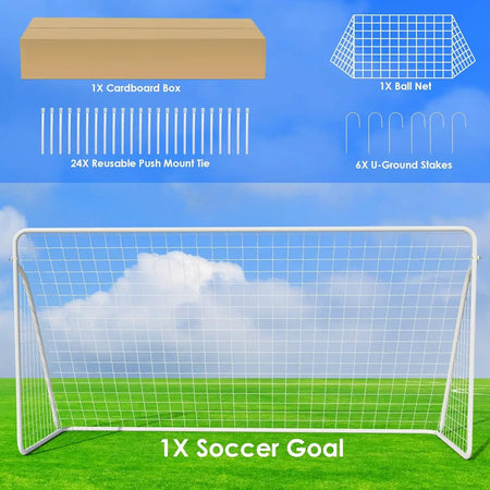 Turn your backyard into a training ground with the Soccer Goal Set 12x6ft. This portable metal-frame goal delivers a sturdy, weatherproof playing experience for players of all ages. The steel tube frame finished in white combines durability with easy transport, so you can set up a backyard practice area, friendly match, or drill session in minutes. Weighing 28 lbs, it’s sturdy enough for daily use yet light enough to move between locations as your practice needs change. Whether you’re coaching kids or enjoying a casual game with friends, this 12x6 ft goal helps sharpen shooting accuracy, passing, and tactical play right at home.