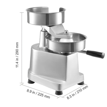 Saate pressida liha ühtlasteks 6" pattideks, mille diameeter on 150 mm, ja paksust saab hõlpsasti reguleerida kasutatava liha koguse järgi. Ergonomiliselt kujundatud kang vähendab pingutust, võimaldades teil toota patte vaid mõne lihtsa sammuga. Kompaktse jalajälje ja umbes 13,4 naela (6,08 kg) kaalu tõttu on see piisavalt kaasaskantav välikioskidesse ja manööverdusvõimeline hõivatud kommertsköökides.