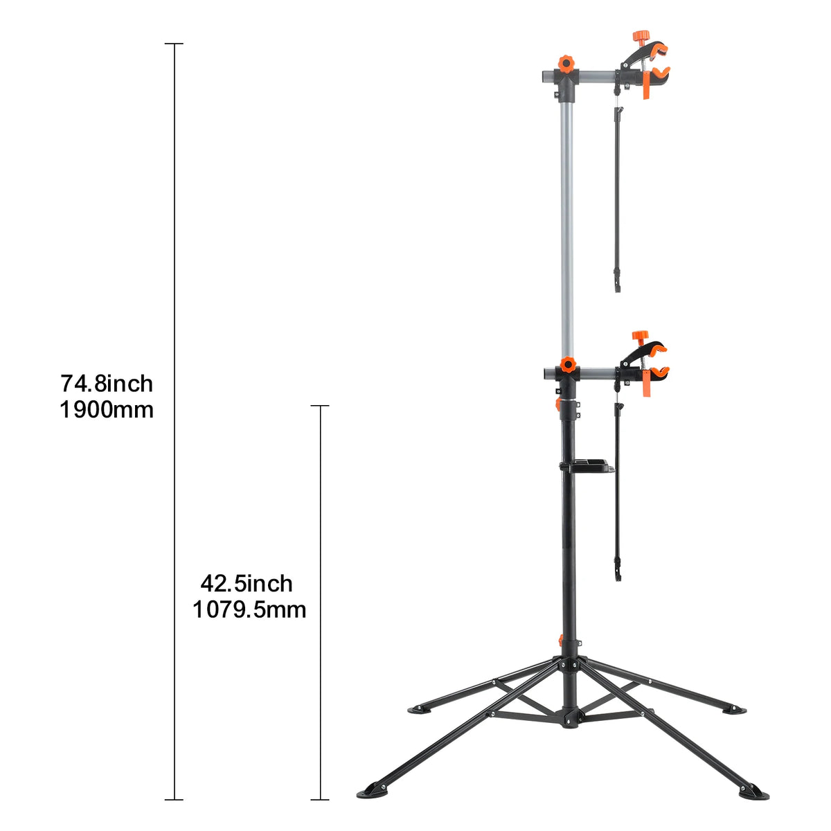 - Mitmekülgne, stabiilne töökoht: Tugev alumiiniumkonstruktsioon, 3-jalaga alus ja libisemisvastane disain hoiavad teie jalgratta hooldustööde ajal, nagu ketimääre või ratta eemaldamine, kindlalt paigal.