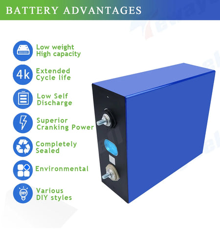 - Operate within recommended temp range and follow charging/discharging guidelines: charging voltage 3.65V, maximum continuous discharge 280A (1C), and a discharge end voltage of 2.5V to protect longevity.