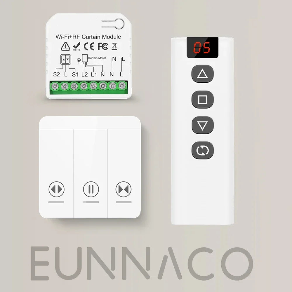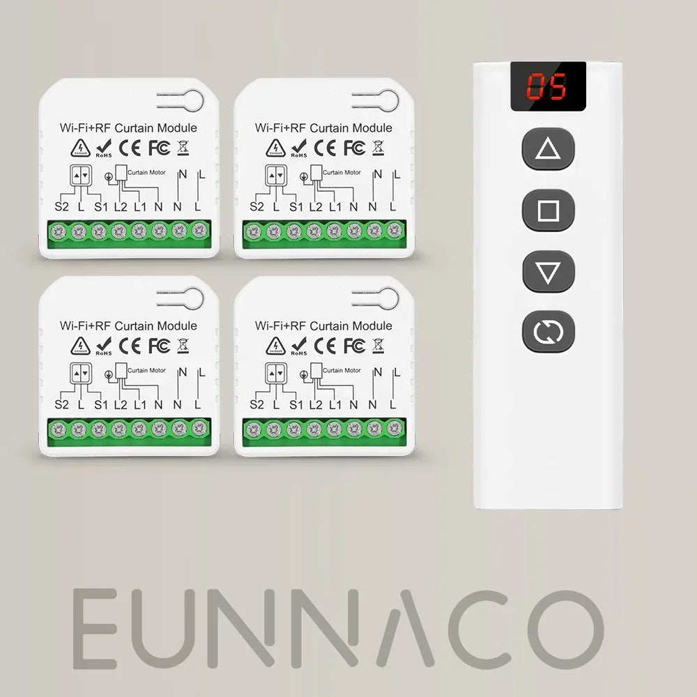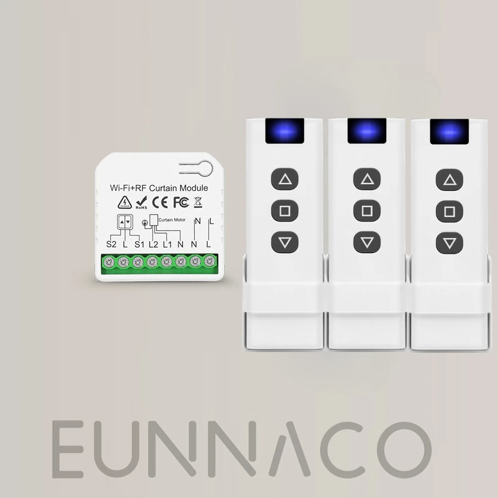 Tuya Smart WiFi Moodul – Häälejuhtimise RF433 Kaugjuhtimispult — Kompaktne nutikas WiFi relee, mis on mõeldud häälejuhtimise, RF433 kaugjuhtimise ühilduvuse ja ajastamise lisamiseks aknakatetele, rullkardinatele, venetsia aknakatetele ja elektrilistele projektsiooniekraanidele kodudes, kontorites ja kaubanduspindadel.