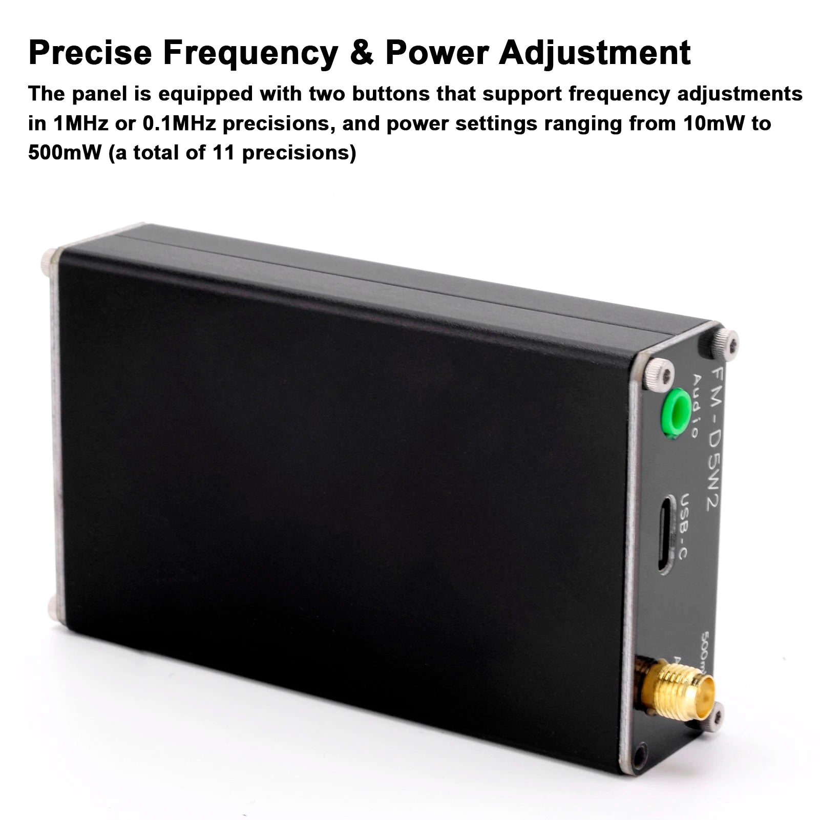 Tutustu FM-lähettimeen 76–108 MHz 500mW Stereo Lähetinlaite — kompakti, metallirakenteinen stereo FM-lähetin, joka muuttaa minkä tahansa äänilähteen lähetysvalmiiksi signaaliksi. Ihanteellinen yksityisiin lähetyksiin, kampusradioihin, luokkahuoneisiin tai ulkoilmatapahtumiin, tämä laite toimii kannettavana radioasemana kirkkaalla äänellä ja joustavalla virityksellä. Huom: paristoa ei sisälly; se saa virtaa USB-C:stä tasaisen suorituskyvyn takaamiseksi.