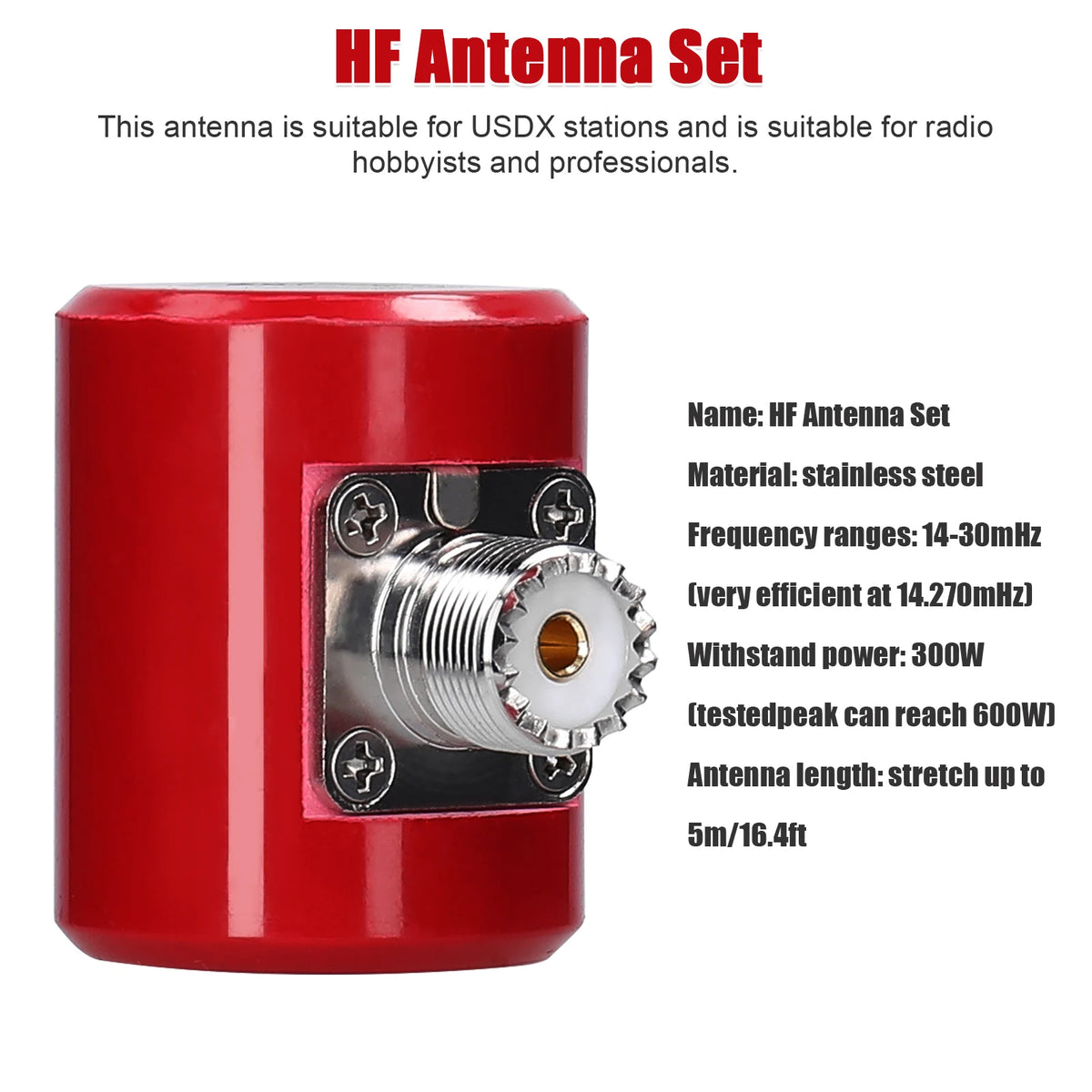 - Pidennettävä muotoilu: venytä elementti jopa 5 m (16.4 ft) optimoidaksesi vastaanoton ja lähetyksen 14-30 MHz -taajuusalueella.