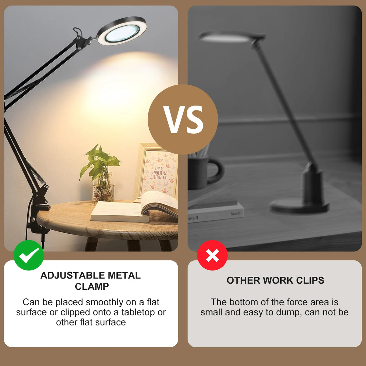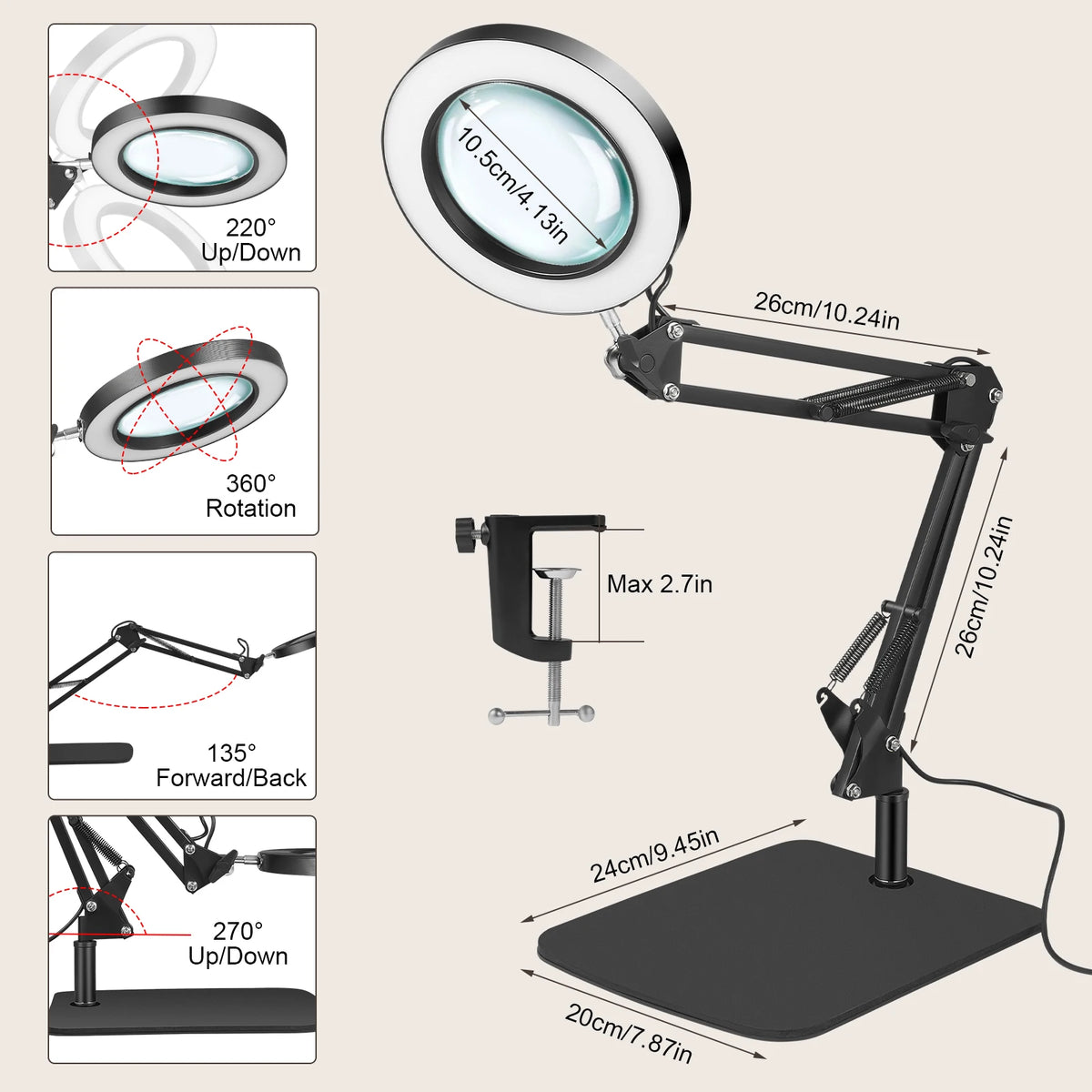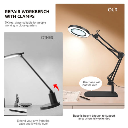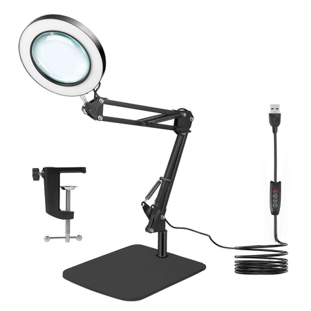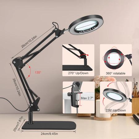 Astut terävämpään yksityiskohtaan 10X suurennus-LED-työpöytälamppulla, jossa on puristuspohja ja kääntyvä varsi Jugacoolilta. Tämä 2-in-1 suurennuslamppu yhdistää tukevan työpöytälampputelineen käytännölliseen puristusvaihtoehtoon, tarjoten kädet vapaana tarkkuutta käsitöissä, pienten tekstien lukemisessa, elektroniikkatöissä, ompelussa, kaiverruksessa, kynsien hoidossa ja muussa. Levennetty raskas pohja pitää laitteen vakaana työpöydälläsi, kun taas puristusteline mahdollistaa valon kiinnittämisen pöydän reunaan tai työpöytään, vapauttaen arvokasta tilaa ja pitäen työtilasi järjestyksessä.
