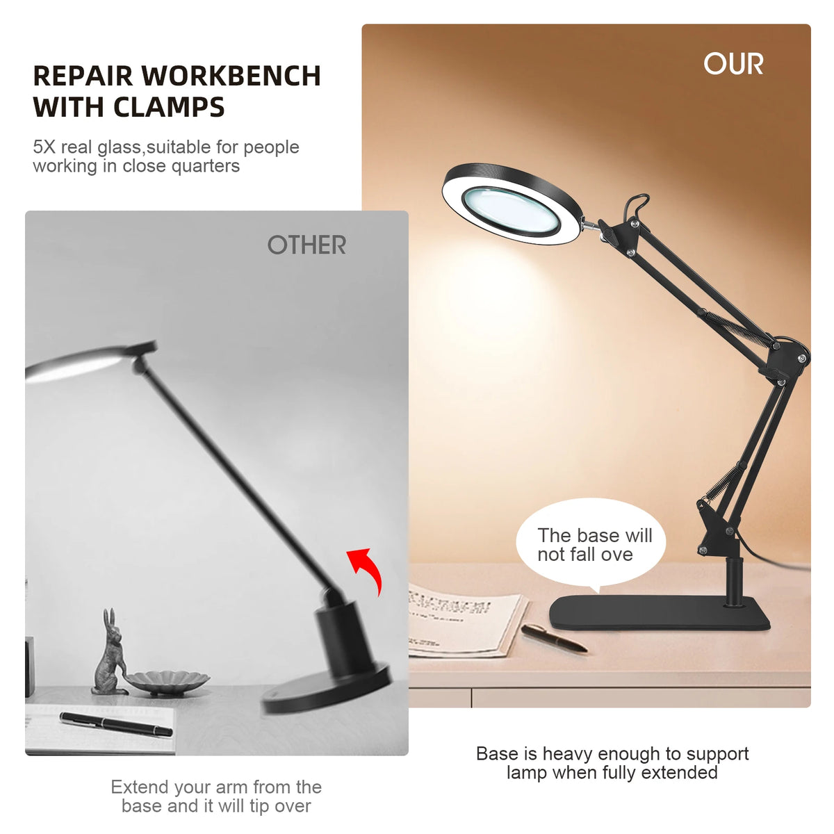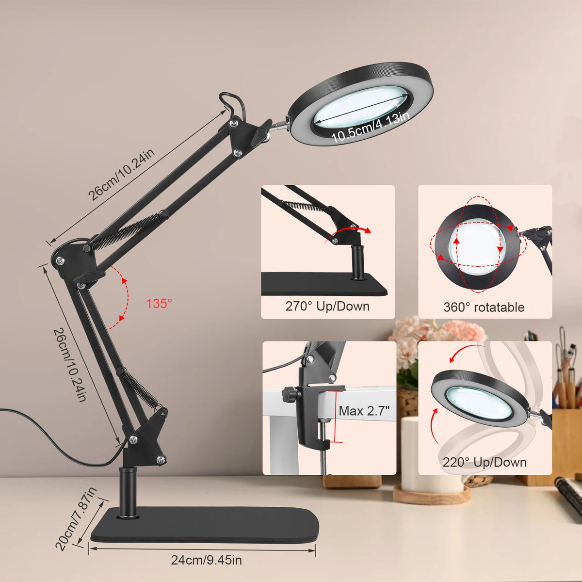 - 1 x 10X suurentava LED-pöytälamppu puristuspohjalla ja kääntyvällä varrella