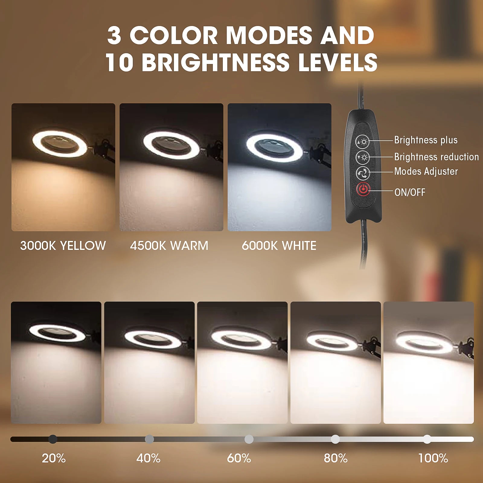 Koe kristallinkirkas suurennus ja kirkas, tasainen valaistus. 10X suurennuslasi auttaa sinua näkemään hienot yksityiskohdat selkeästi, vähentäen silmien rasitusta pitkien istuntojen aikana. 72 korkealaatuista LEDiä tarjoavat pehmeän, tasaisen valokentän, joka kattaa suuren säteilyalueen ilman vilkkumista tai häikäisyä. Valitse kolmesta värimoodista — valkoinen, lämmin ja keltainen — ja säädä täydellinen kirkkaus 10 %:sta 100 %:iin mihin tahansa tehtävään. Se on suunniteltu olemaan hellä silmille ja helppo käyttää laseilla, mikä tekee siitä loistavan lahjan kaikille, jotka työskentelevät pienten komponenttien, monimutkaisten suunnitelmien tai lukijoiden kanssa, jotka tarvitsevat lisävisuaalista tukea.
