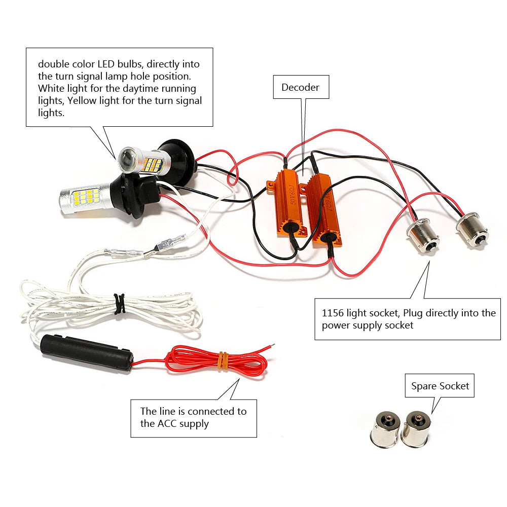 Suunniteltu tarjoamaan johdonmukaista, pitkäkestoista valaistusta, LED-ryhmä tuottaa puhtaan päivänvalkoisen päiväajovalon ja erottuvan meripihkan/keltaisen vilkkusignaalin. 42 LEDin ja kompaktin 1156-liittimen kanssa moduuli toimii DC12V:lla ja tarjoaa dramaattisen päivityksen perinteisiin halogeenilamppuihin verrattuna. Järjestelmä on suunniteltu pitkäikäiseksi: pitkä käyttöikä, ei hehkulankaa ja kestävyys yleisiä iskuja ja tärinää vastaan—kyky kestää hyvin yli tyypillisten ajoneuvojen elinkaarien. Kun ajat, nautit kirkkaasta valkoisesta päiväajovalosta; kun vilkutat, valo vaihtuu keltaiseksi ja vilkkuu, tarjoten välitöntä, erehtymätöntä näkyvyyttä muille kuljettajille.