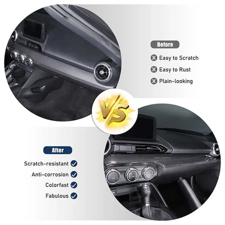 Päivitä Mazda MX-5:si ohjaamo Real Carbon Fiber Center Console Cover -kansilla, jonka on valmistanut cheya. Valmistettu korkealaatuisesta aidosta hiilikuidusta, tämä sisustuskoristepaneeli istuu tiukasti tehtaan keskikonsolin päälle, luoden vaikuttavan, kilpailuhenkisen ilmeen. Suunniteltu Mazda MX-5:lle 2016+ ja valmistettu ISO9001-sertifioidussa tehtaassa Manner-Kiinassa, se tarjoaa kestävyyttä, premium-viimeistelyn ja helpon huollon. Se auttaa myös suojaamaan alkuperäistä konsolia naarmuilta, kolhuilta ja päivittäiseltä kulumiselta. Kaikki InterCypruksen EU-maihin myymät sähköiset ja mekaaniset laitteet, laitteet ja koneet ovat CE-sertifioituja ja niillä on kahden vuoden takuu.