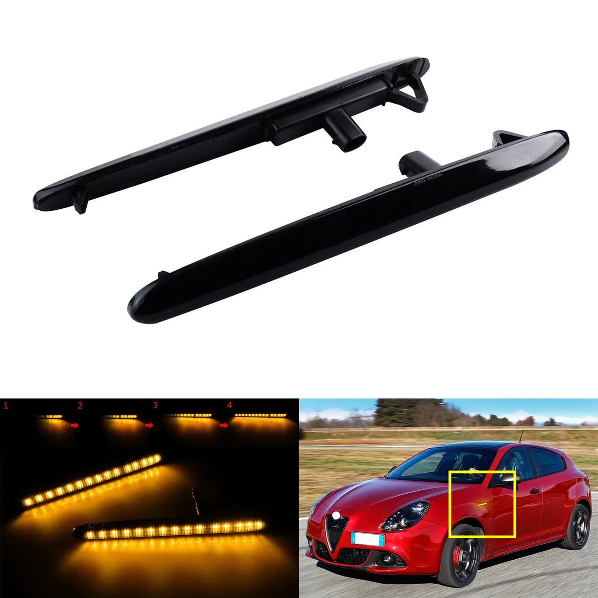 - 1 pari dynaamisia meripihkan värisiä LED-sivunäyttömerkkejä mustalla savulinsillä Alfa Romeo Giuliettaan