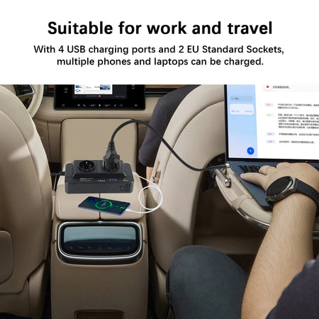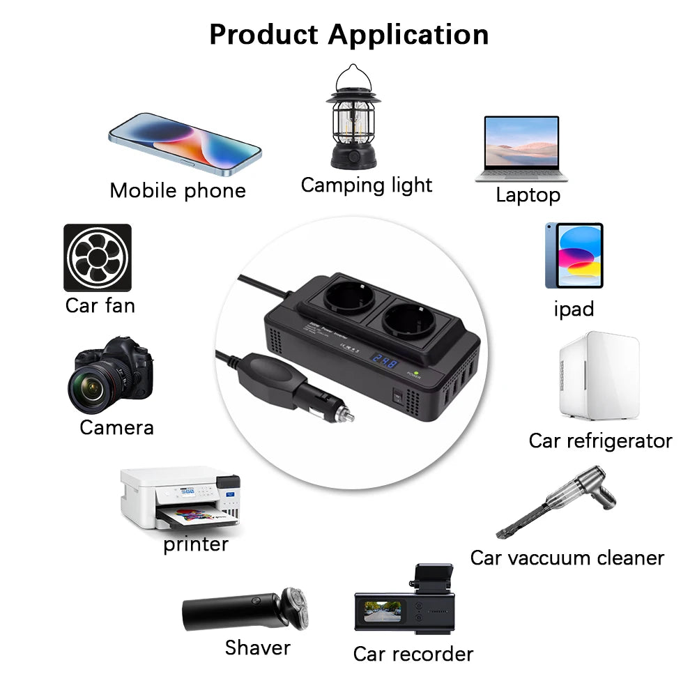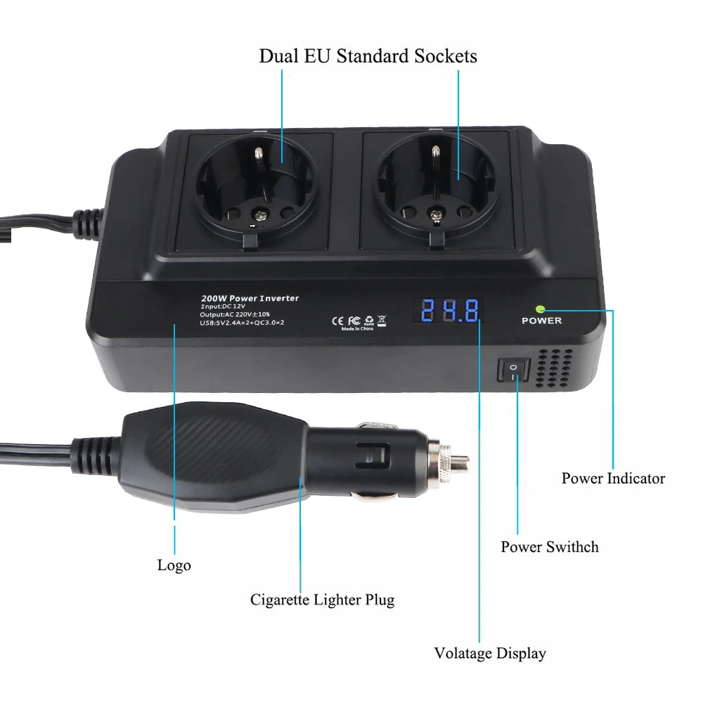Vahvista seikkailujasi 200W auton virtamuuntimella, kompakti ja luotettava ratkaisu, joka muuntaa 12V auton virran käyttövalmiiksi 220V vaihtovirraksi. 200W jatkuvalla tehoilla ja 400W huipputeholla se pyörittää vaivattomasti tärkeitä laitteita liikkeellä ollessasi—täydellinen älypuhelimille, kannettaville tietokoneille, tableteille, GPS-laitteille, pienille televisioille, akkulatureille, retkeilyvarusteille ja kannettaville toimistovälineille. Kaksinkertaiset EU-pistokkeet ja neljä USB-porttia mahdollistavat jopa kuuden laitteen lataamisen samanaikaisesti, mikä tekee siitä monipuolisen kumppanin automatkoille, retkeilyyn tai mobiilitoimistoon.