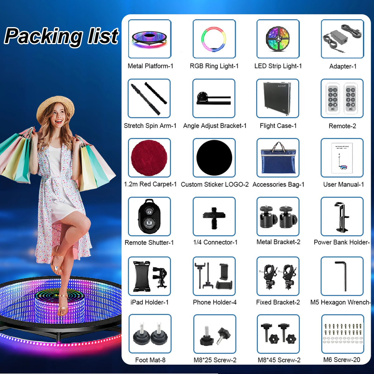 Korota tapahtumia 360 Photo Boothilla, jossa on 80 cm LED-lasi ja automaattinen pyöritys. Tämä premium-asetus yhdistää tyylikkään 80 cm LED-lasi-alustan sujuvaan, automaattiseen pyöritykseen, joka tallentaa mukaansatempaavia 360 asteen valokuvia, joista vieraat pitävät. Täydellinen häihin, juhliin, festivaaleille, vuokrauksiin ja yritystapahtumiin, se luo mukaansatempaavia hetkiä, joita osallistujat haluavat jakaa yhä uudelleen.