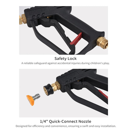 Tutustu 4000 PSI autonpesupistooliin, jossa on neljännesnopeusliittimet — korkean suorituskyvyn työkalu, joka on rakennettu käsittelemään raskaita puhdistustehtäviä vaivattomasti. Rakennettu messingistä, ruostumattomasta teräksestä ja muovista, se tarjoaa tehokasta puhdistusta autoille, ajoteille ja terasseille, samalla kun turvalukko auttaa suojaamaan sinua ja muita käytön aikana. 1/4" nopeusliitin mahdollistaa nopean ja vaivattoman asennuksen, joten käytät vähemmän aikaa valmisteluun ja enemmän aikaa puhdistamiseen.