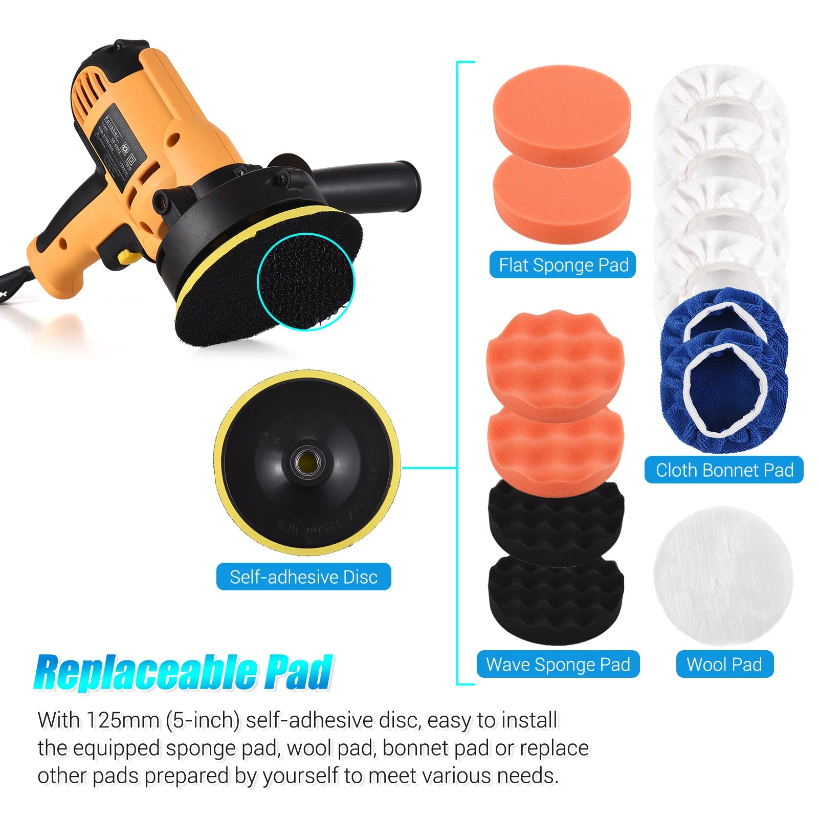 - Kiillota, vahaa, kiillota ja poista pyörteet auton pinnoilta näyttelykunnon saavuttamiseksi 700W moottorilla ja säädettävällä nopeudella.