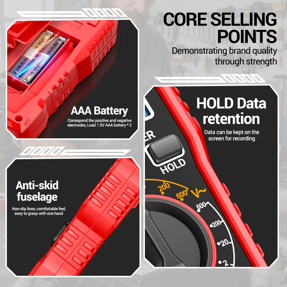 - Suorita nopeita AC/DC-jännitetarkistuksia (20–600V) pistorasioissa, virtalähteissä ja piireissä luottavaisin mielin.