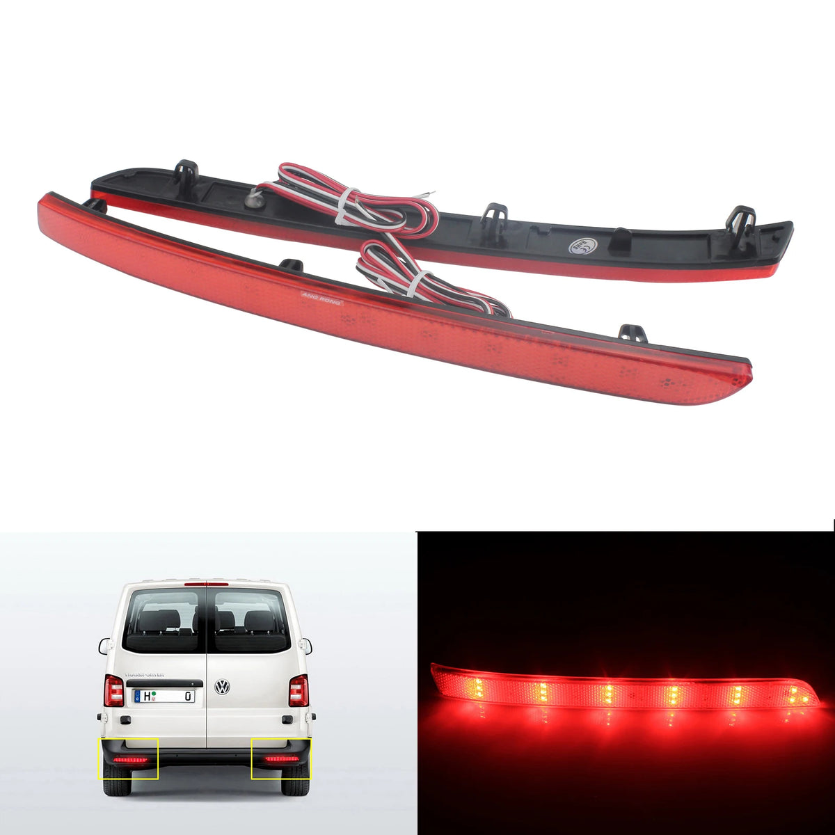 Päivitä VW T5 Transporterisi, Caravellen tai Multivanin takavalot tällä LED-puskureiden heijastimien parilla. Suunniteltu facelift-malleille vuosilta 2012–2016, nämä punaiset LED-valot korvaavat vakiopuskureiden heijastimen ja lisäävät monitoimista valaistusta turvallisempaan ja varmempaan ajamiseen. Jokainen lamppu on 275 mm pitkä ja siinä on 36 korkealaatuista 3528/1210 SMD LEDiä, jotka tuottavat kirkkaan, tasaisen punaisen hehkun, joka parantaa näkyvyyttä päivällä, sateessa ja heikossa valaistuksessa. Vesitiivis rakenne takaa luotettavan toiminnan kaikissa sääolosuhteissa, ja 12 V DC -käyttö tekee niistä yhteensopivia eurooppalaisten sähköjärjestelmien kanssa. Nämä lamput on suunniteltu OEM-istutukseen osanumeroilla 7E0945105, 7E0945106 (ja 7E0945105A, 7E0945106A). Asennus on yksinkertaista: yhdistä musta/sininen johto jarruvalon negatiiviseen, valkoinen signaali/takavalon positiiviseen ja punainen jarruvalon positiiviseen. Tämä pari toimii korvaavana puskureiden heijastimena ja laajentaa signaalointimahdollisuuksia takavaloon, jarruvaloon, takasumuvaloon ja suuntavilkkuun, antaen ajoneuvosi yhtenäisen, modernin ilmeen.