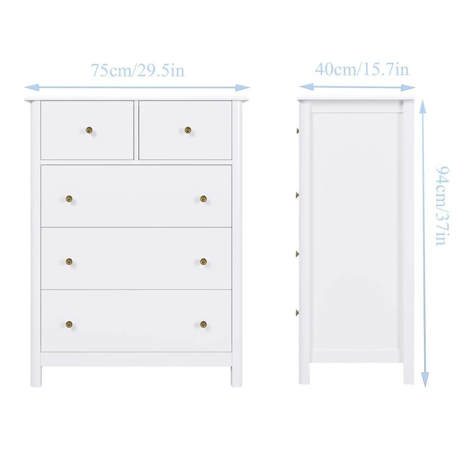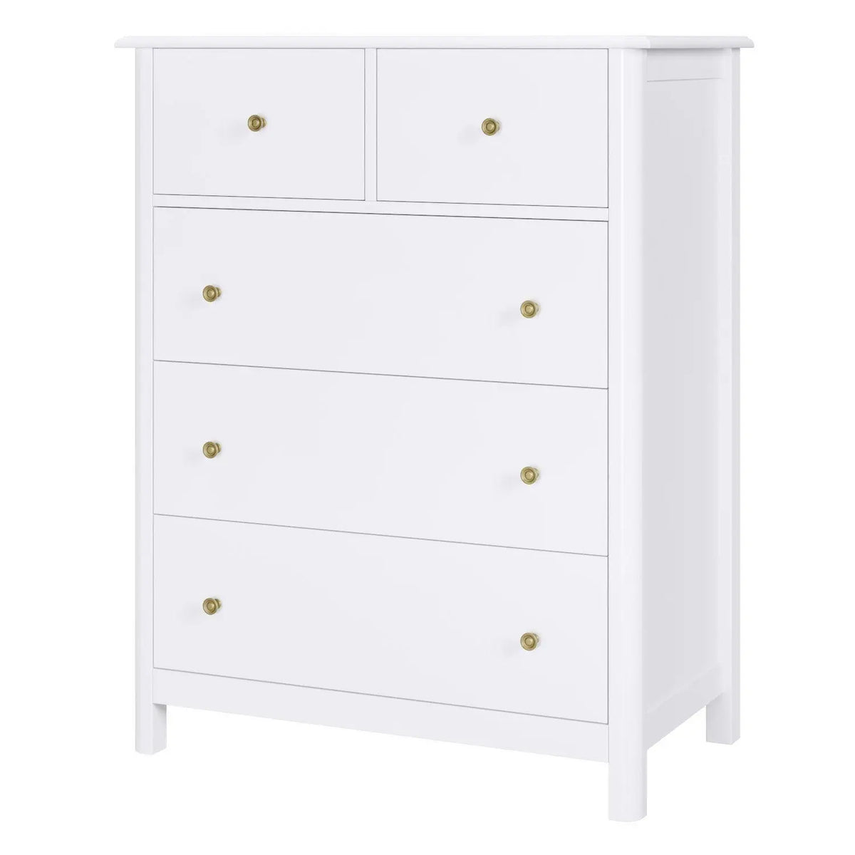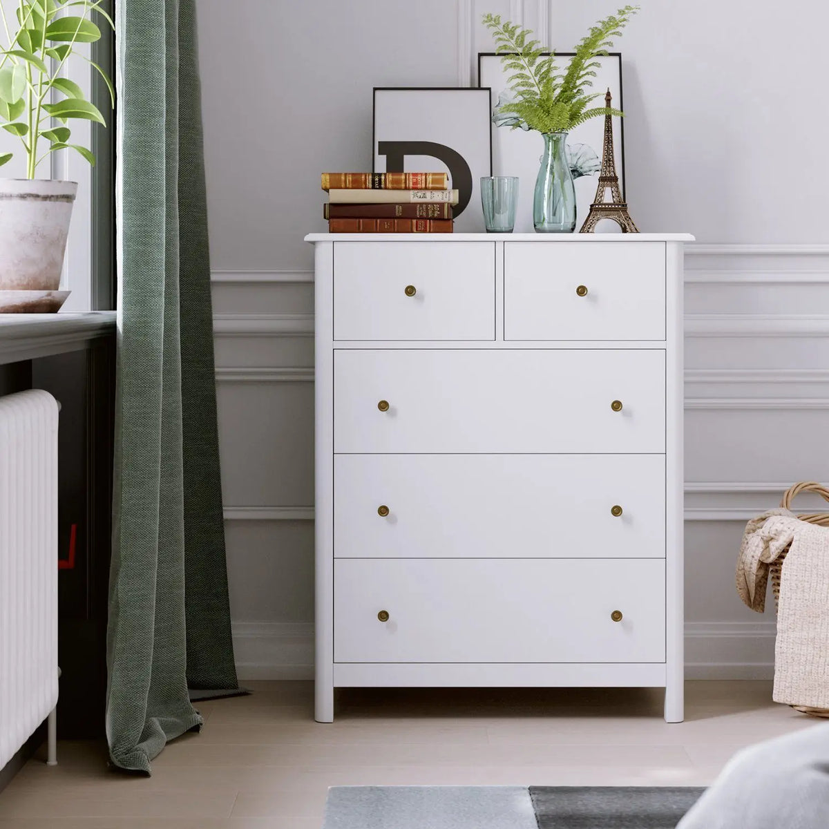 Suunniteltu maksimoimaan säilytys ilman, että se ylittää huonetta, siinä on viisi laatikkoa eri leveydellä, jotka mahtuvat kaikkeen alusvaatteista ja sukista peittoihin ja pieniin koriste-esineisiin. Laaja yläpinta on täydellinen valokuvien, kehysten tai pienen kasvin esittelyyn, kun taas lipasto voi toimia myös televisiotelineenä tai ylimääräisenä säilytyksenä olohuoneessa. Sen tyylikkäät valkoiset kaapit kultaisilla retrokahvoilla lisäävät ripauksen eleganssia, joka täydentää monia sisustuksia.