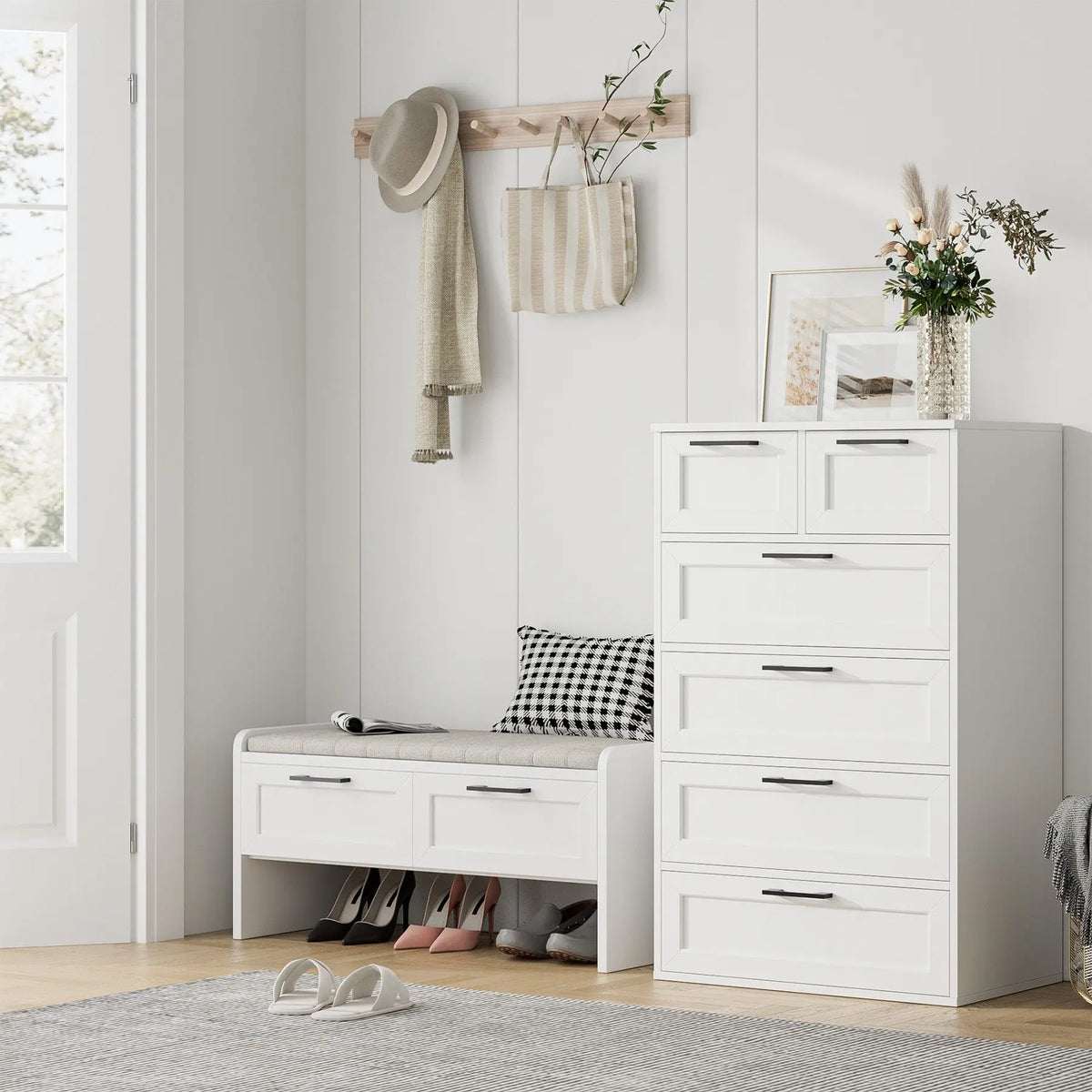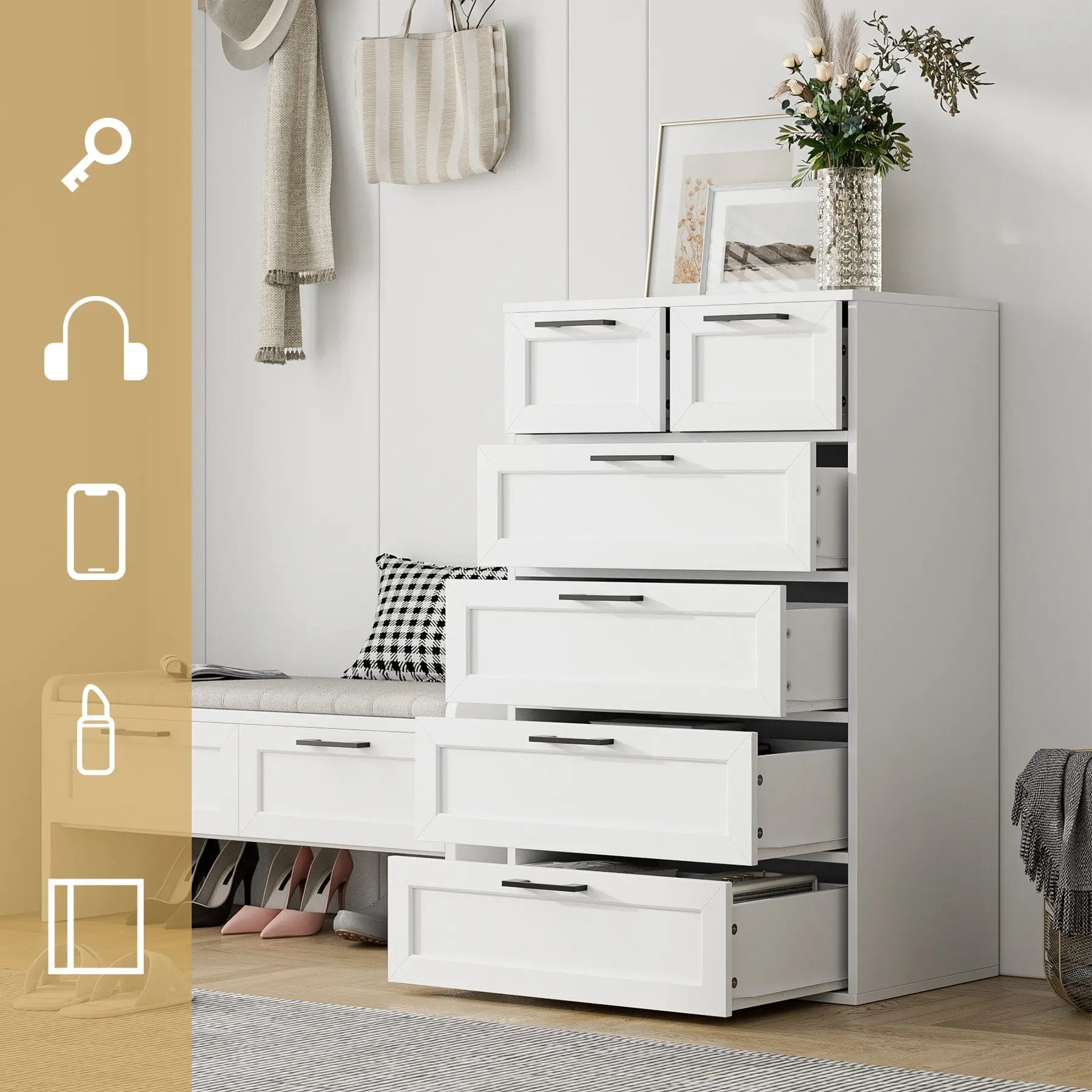 Valkoinen lipasto, jossa on kuusi laatikkoa, kapea vaatekaappi makuuhuoneeseen