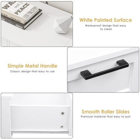Moderni, minimalistinen muotoilu sisältää viistetyt etupinnat, puhtaan valkoisen paneelin ja tyylikkäät mustat kahvat, jotka eivät koskaan mene pois muodista. Kestävästä MDF:stä valmistettu pinta on viimeistelty kosteudenkestävällä pinnoitteella kestävyys ja helppo puhdistus mielessä. Kestävät metalliset laatikkohyllyt varmistavat sujuvan, hiljaisen toiminnan, jotta voit avata ja sulkea laatikot vaivattomasti, päivästä toiseen.
