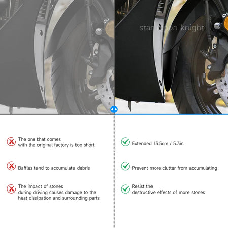 Paranna suojaa Yamaha FJR 1300:lle Yamaha FJR 1300 Fender Extenderin avulla, joka on roiskesuojattu etulokasuojan pidennys. Tämä korkealaatuinen ABS-etulokasuojan pidennys lisää roiskesuojatun suojan, joka ohjaa likaa, kiviä ja roskia pois kriittisistä komponenteista säilyttäen samalla pyörän tyylikkään ilmeen. Suunniteltu seuraamaan etulokasuojan muotoja, tämä pidennys tarjoaa pitkäkestoisen, kestävän suojan ja auttaa suojaamaan pakoputkea, alamoottoria ja jäähdytintä kivivaurioilta. 135 mm:n pidennys integroituu saumattomasti pyöräsi linjoihin ja vähentää lian kertymistä ajon aikana, erityisesti märillä tai sorateillä.