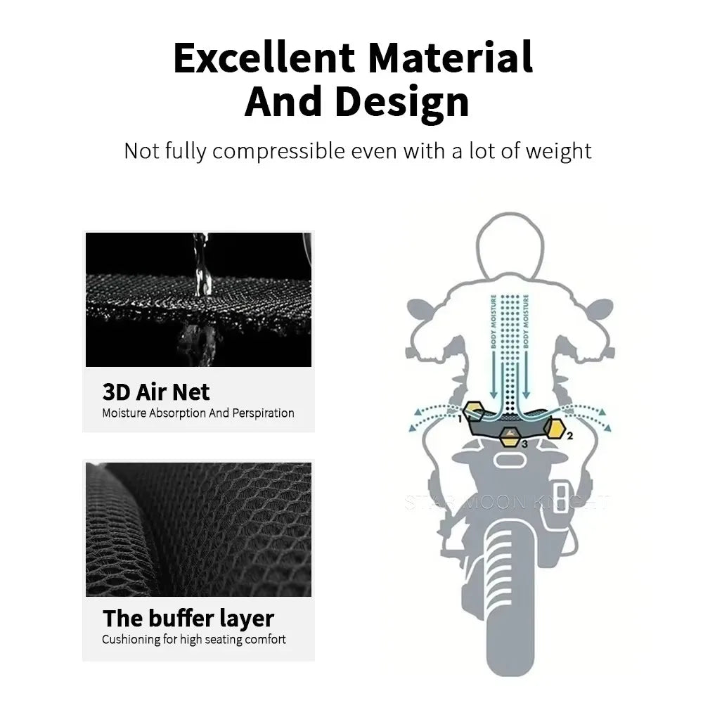 Kolmiulotteisella verkolla suunniteltu suojus edistää jatkuvaa ilmanvirtausta allaasi ajon aikana. Tämä pysyvä ilman kierto auttaa pitämään pakarat kuivina sateisella säällä ja estää lämmön kertymistä pitkillä matkoilla. Jopa suoran auringonvalon alla suojus pysyy viileänä ja mukavana, kun taas pehmustekerros tarjoaa hierontamaisen tunteen, joka auttaa vähentämään väsymystä tuntien istumisen jälkeen.