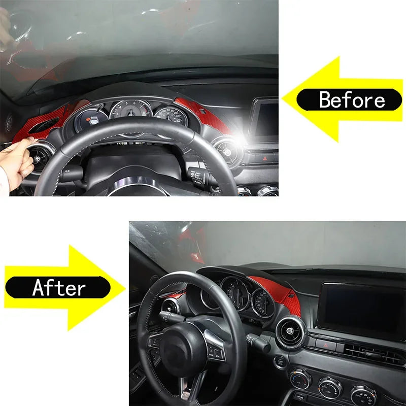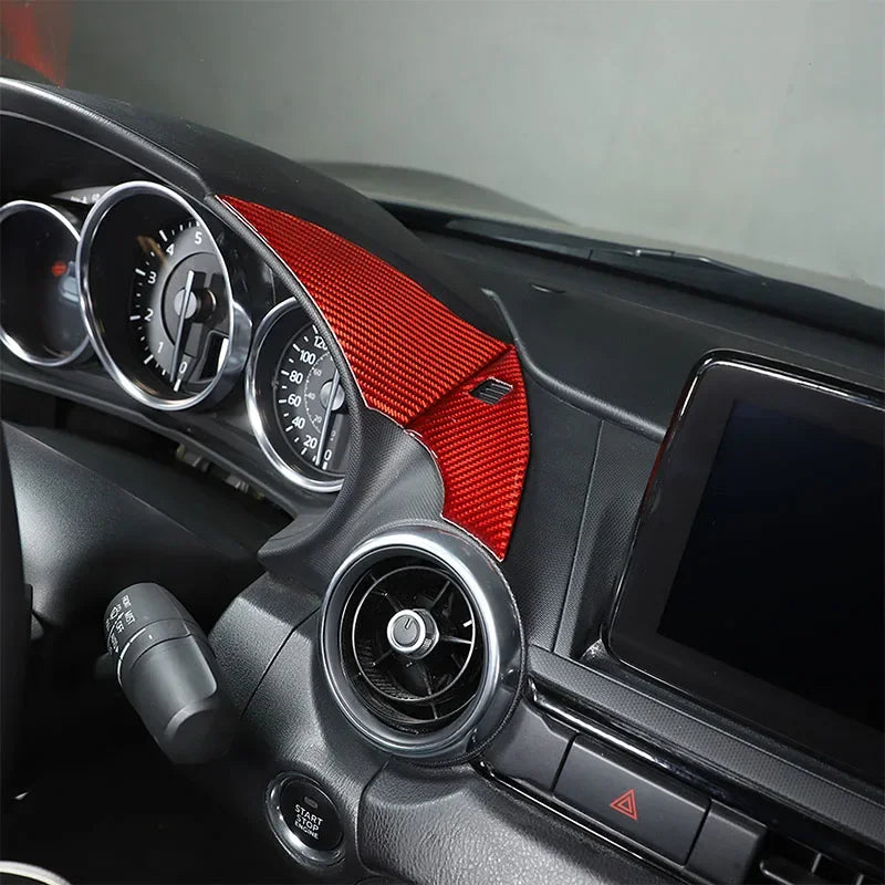 Nosta Mazda MX-5:si sisätilat Mazda MX5 2016-2023 pehmeällä hiilikuitukojelaudankannella. Tämä 4-osainen setti käyttää laadukasta pehmeää hiilikuitua, jossa on hiilikuitu/punainen viimeistely, tarjoten urheilullisen, hienostuneen ilmeen kojelaudan molemmille puolille. Suunniteltu Mazda MX-5 -malleille vuosilta 2016–2023, tämä koristeellinen tarratyyppinen sisätilamuutos kiinnittyy autoteollisuuden luokan liimalla, tarjoten helpon, työkaluvapaan päivityksen, joka suojaa kojelautaa auringolta ja päivittäiseltä kulumiselta.