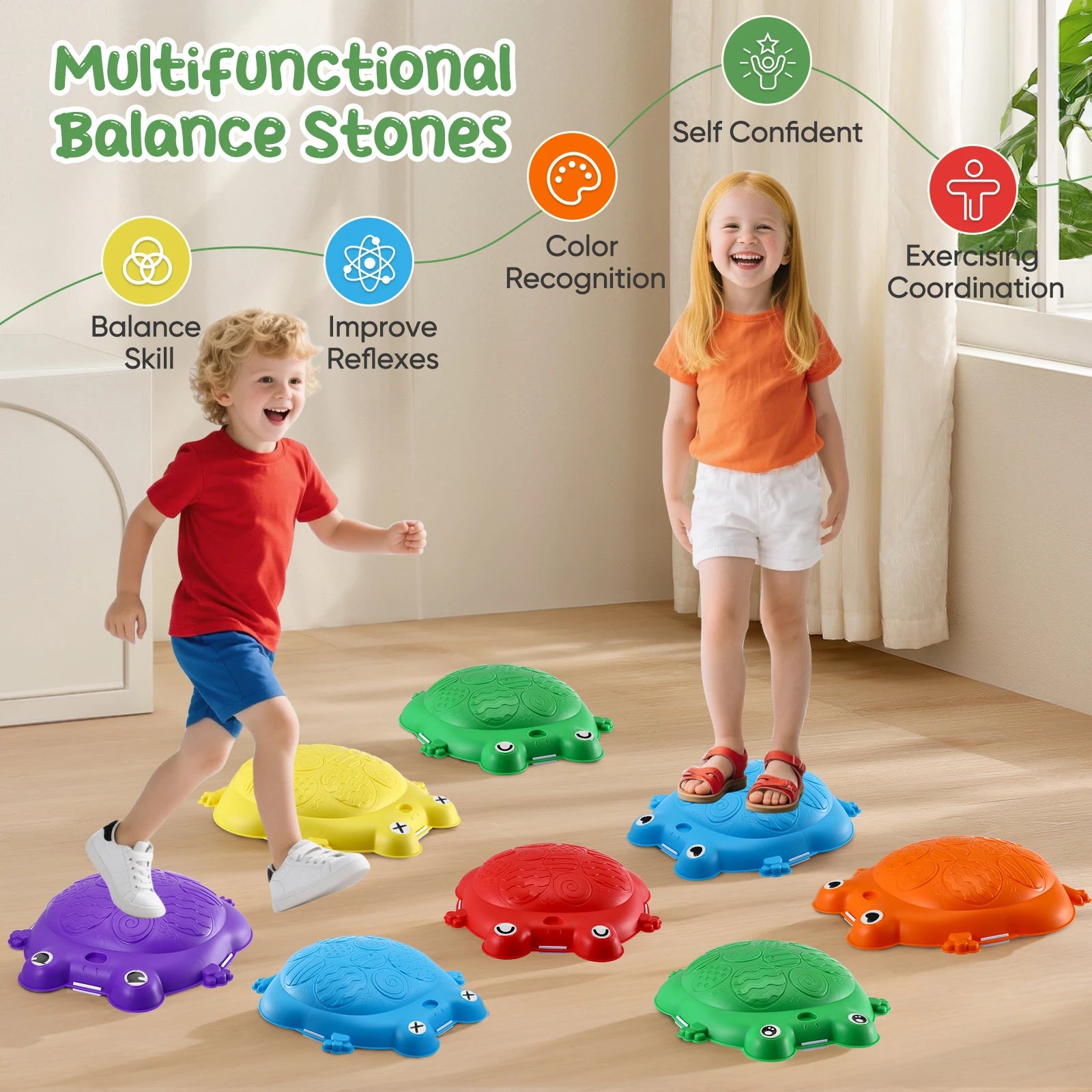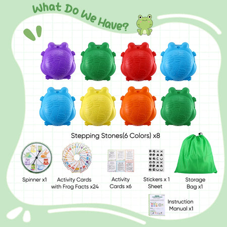 Lapset voivat järjestää kivet lukemattomiin kuvioihin kehittääkseen tasapainoa, koordinaatiota ja tilatietoisuutta samalla kun nauttivat värintunnistuksesta ja ongelmanratkaisutehtävistä. Setti sisältää DIY-tarroja, pyörijän ja aktiviteettikortteja, joissa on mukaansatempaavia pelejä, jotka yhdistävät oppimisen liikkumiseen, kannustaen tiimityöhön, luovuuteen ja fyysiseen itseluottamukseen ohjatun tai itse keksityn leikin kautta.