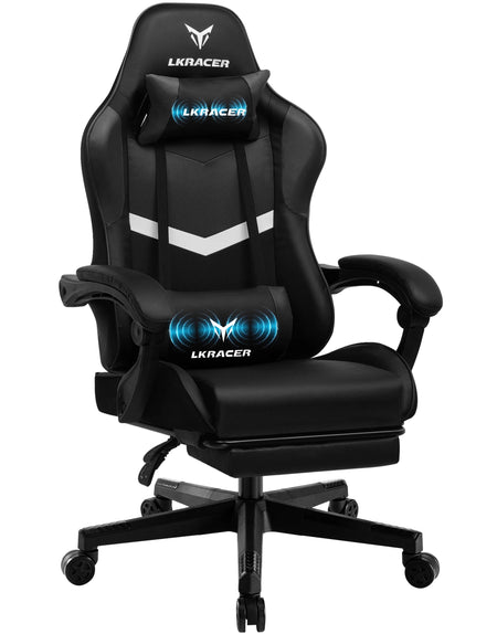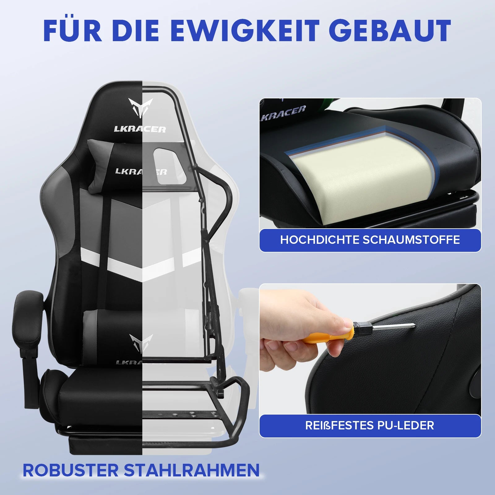 Päivitä työtilasi tai peliasetuksesi LUCK RACER Pelituolilla, jossa on jalkatuki ja lannerengas. Suunniteltu mukavuutta varten pitkillä istunnoilla, tämä tuoli yhdistää ergonomisen tuen, vetäytyvän jalkatuen ja tukevan rungon auttaakseen sinua ylläpitämään oikeaa asentoa, vähentämään väsymystä ja pysymään keskittyneenä, olitpa sitten pelaamassa, koodaamassa tai suunnittelemassa. Painokapasiteetti on jopa 150 kg, 135° kallistus ja 360° kääntö, se mukautuu tarpeisiisi ja tilaan.