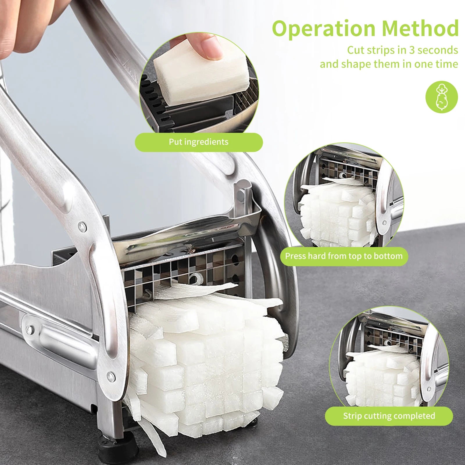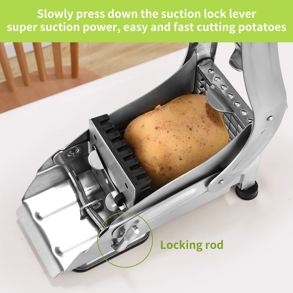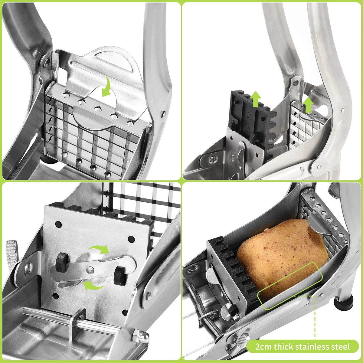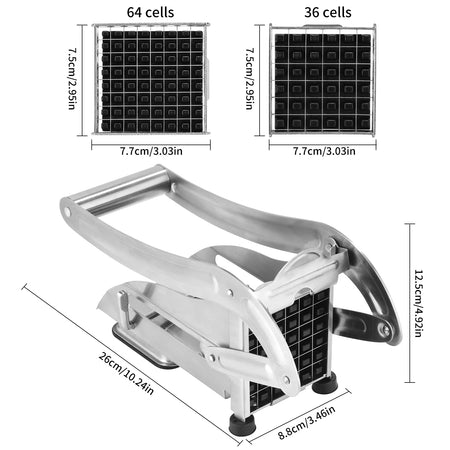 Valmista ravintolakäyttöön sopivia ranskalaisia kotona ruostumattomasta teräksestä valmistetulla ranskalaisen perunan leikkurilla, jossa on kaksi viipaleterää. Elintarvikelaatuisesta ruostumattomasta teräksestä valmistettu kestävä silppuri sisältää kaksi leikkuulisäosaa monipuoliseen ranskalaisen perunan paksuuteen: 9x9 mm ja 12x12 mm (64/36 reikää). Turvallinen imukuppipohja pitää sileät työtasot vakaana ja liukumattomana leikkauksen aikana, mikä helpottaa perunoiden, kurkkujen, porkkanoiden, omenoiden ja muiden läpi painamista. Kätevä työkalu kiireisille perheille ja kotikokeille, jotka haluavat nopeita, tasaisia tuloksia ilman hukkaa.
