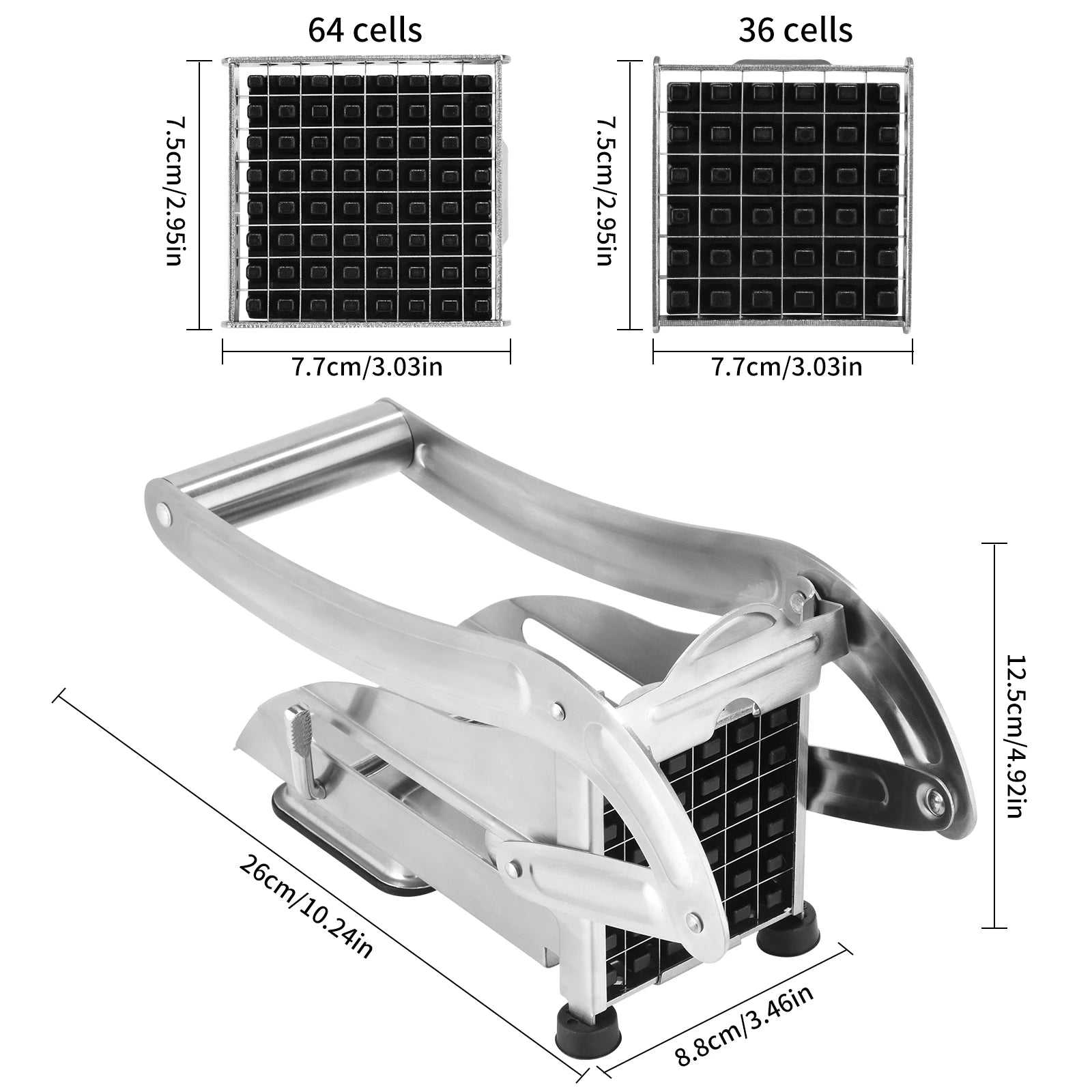 - Monipuoliset leikkausvaihtoehdot: vaihda 9 mm ja 12 mm terien välillä tuottaaksesi hoikkia ranskalaisia tai paksumpia gourmet-leikkauksia (64/36 reikää).