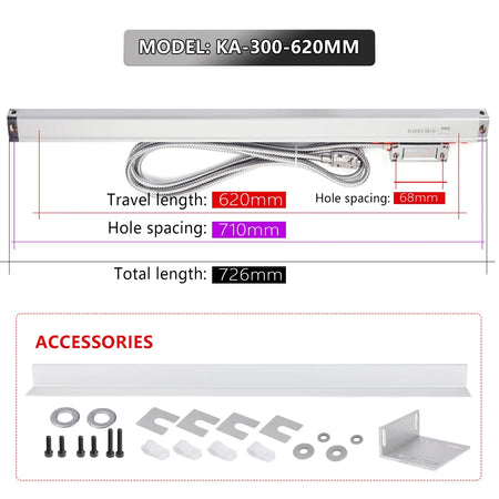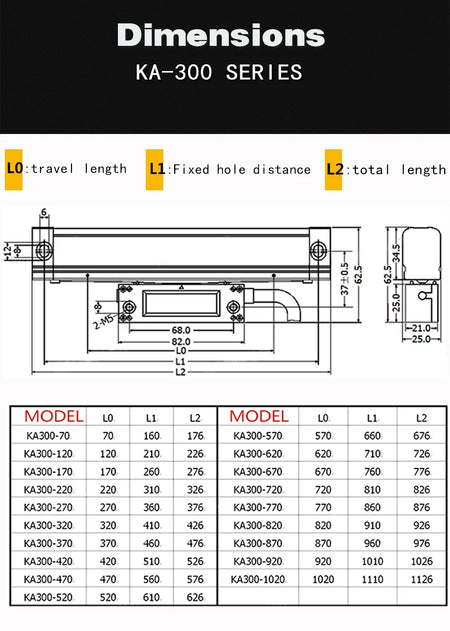 - Huomautukset: Asennusreikien etäisyys on ilmoitettu muodossa Travel+90 mm; KA-300 on yhteensopiva laajan valikoiman DRO:iden kanssa