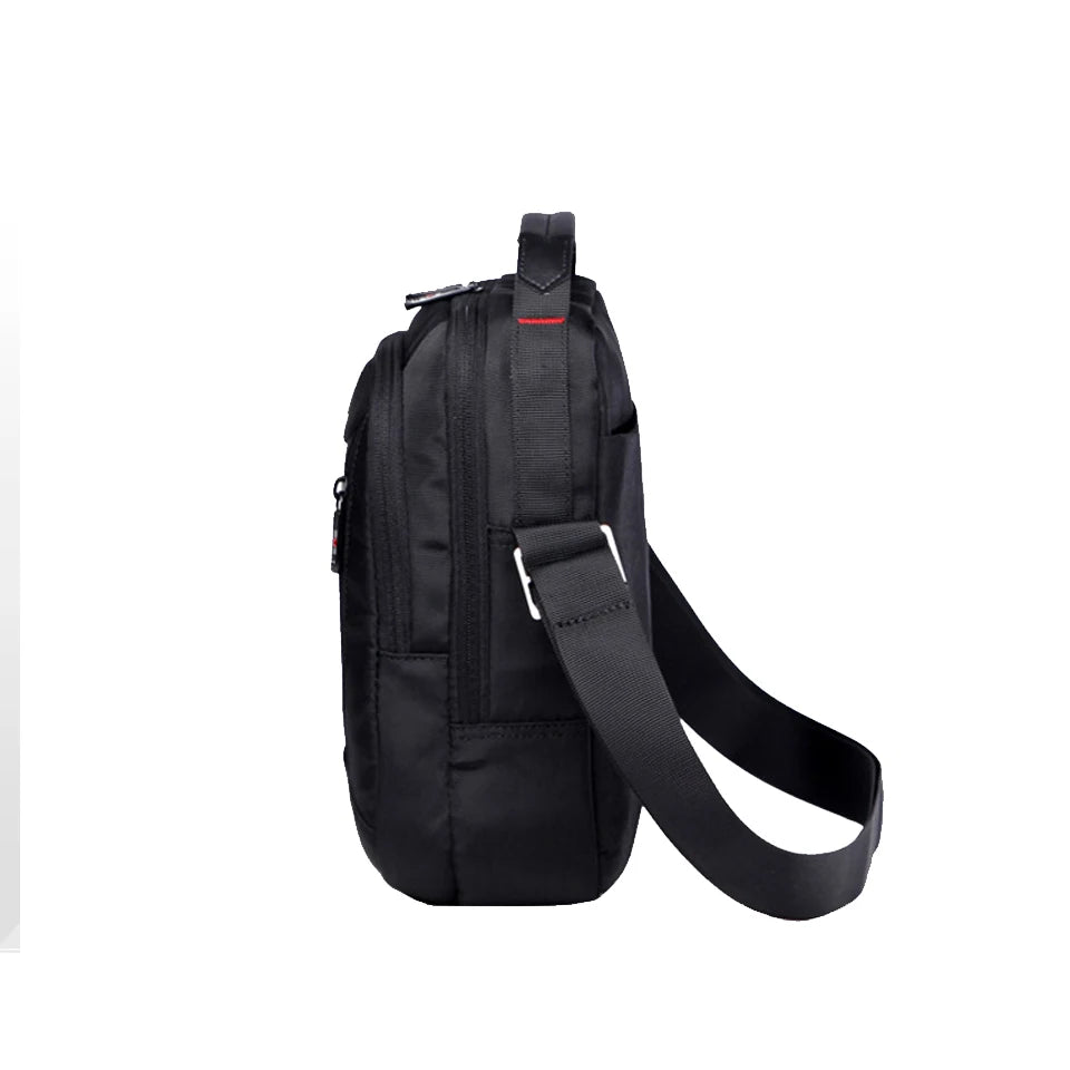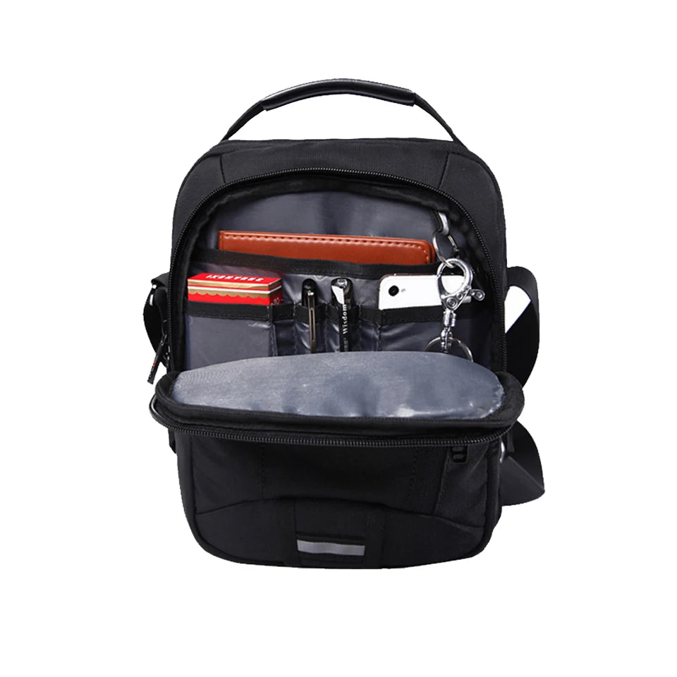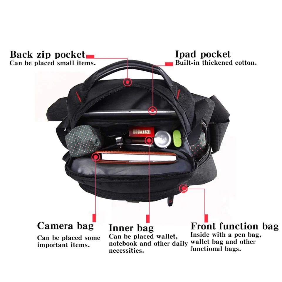 Tervetuloa Sveitsiläiseen Vedenpitävään Oxford Messenger Laukkuun Miehille Unisex Ultra Kevyt Monitoiminen Liikematkalaukku — monipuolinen, ultra-kevyt kantolaukku, joka on suunniteltu kiireisille ammattilaisille liikkeellä. Kestävästä Oxford-kankaasta valmistettu laukku, jossa on vedenpitävä pinta, pitää tärkeät tavarasi kuivina sateessa ja roiskeissa, painaen vain 0,5 kg. Yksinkertainen musta ulkopinta, läppädesign ja turvallinen vetoketjukiinnitys yhdistävät siistin, ammattimaisen ilmeen käytännölliseen suojaan. Sisällä löydät älykkään organisoinnin, johon kuuluu sisäinen slot-tasku, matkapuhelintasku, sisäinen vetoketjutasku, sisäinen osasto ja erityinen tietokonekerros, joka pitää kannettavat tietokoneet ja asiakirjat turvassa. Unisex-tyyli takaa mukavan istuvuuden sekä miehille että naisille, olitpa sitten menossa toimistoon, lentokentälle tai päivittäiselle työmatkalle.