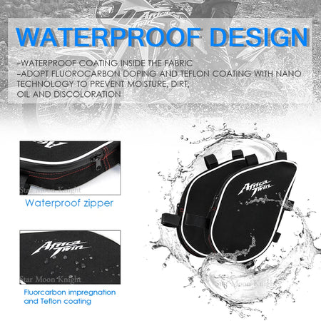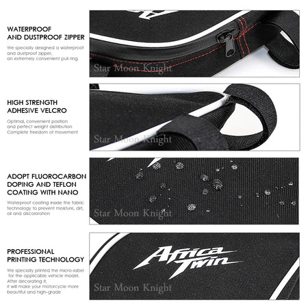 Tutustu Honda Africa Twin CRF1000L Työkalulaukkuun, jossa on vedenpitävä tekstiilikehyksen kiinnitys korjaustyökaluja varten — älykäs, säänkestävä säilytysratkaisu, joka on suunniteltu kuljettajille, jotka haluavat nopean pääsyn korjaustarvikkeisiinsa ilman ylimääräistä tilaa. Tämä pari kehyslaukkuja sopii tiukasti Africa Twinin kehykseen, pysyen turvallisesti paikallaan jopa karuilla teillä. Vedenpitävistä tekstiileistä, joissa on kumipinnoitettu sisus, nämä laukut suojaavat työkaluja, hanskoja ja pientä ensiapupakkauksia sateelta, roiskeilta ja tien likaantumiselta. Ne on helppo asentaa kuudella tarranauhalla ja tiivistetyillä vetoketjuilla, jotka pitävät sisällön kuivana ja turvallisena. Kompaktit mitat (Leveys 12 cm x Korkeus 21 cm x Syvyys 6 cm) täyttävät tarkoituksellisesti penkin alustan tilan estämättä käsittelyä tai mukavuutta. Täydellinen työkalujen, vara-hanskojen tai hätäosien kuljettamiseen päivittäisillä ajoreissuilla tai pidemmillä seikkailuilla.