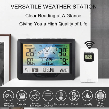 Pysy sään edellä Langattoman Digitaalisen Sääaseman Ulkoisen Anturin Kosteuden avulla. Tämä monipuolinen asema sisältää suuren värillisen LCD-näytön, joka näyttää selkeästi sisä- ja ulkolämpötilan ja kosteuden (maksimi/minimi-tiedot), ajan/päivämäärän, päivittäiset sääikonit, kuun vaiheet, ilmanpaineen ja henkilökohtaisen ennusteen. Kolme kanavaa vastaanottimella voit liittää jopa kolme langatonta ulkoista anturia ja seurata olosuhteita kotisi ympärillä astumatta ulos. 60 metrin langaton siirtoalue ja IPX4-vesitiivis ulkoanturi varmistavat luotettavat mittaukset todellisissa olosuhteissa. Vaihda ℃ ja ℉, mb/hPa ja inHg, ja lue viikkotiedot yhdellä viidestä kielestä. Pääyksikkö voi toimia 2x AA-paristoilla (ei sisälly) tai USB-virralla joustavaa sijoittamista varten. Huom: tämä ilmoitus kattaa Langattoman Sääaseman tuotteen; on olemassa erilliset valkoiset ja mustat anturiversiot - valitse oikea tuote ennen ostamista.