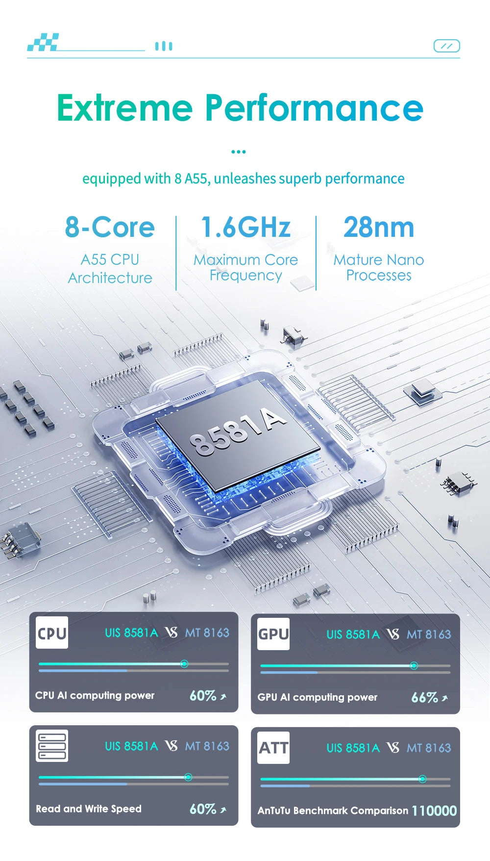 - CPU: Quad Core 1.2 GHz (Osmojezgreni UIS 8581A 1.8 GHz)
