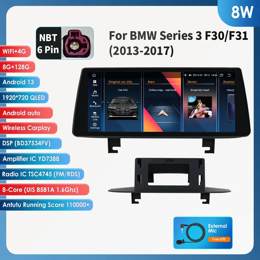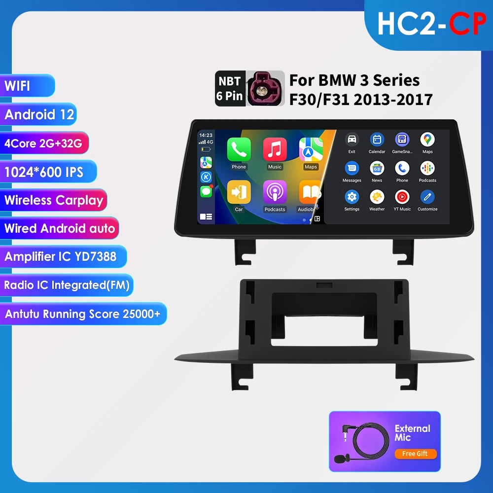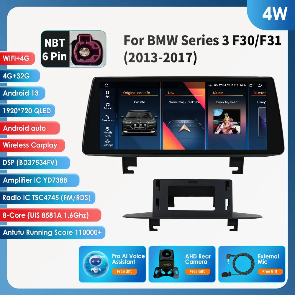 Nadogradite svoj BMW 3 Serije F30/F31 s 10.25 CarPlay Android 13 Auto Auto Radijom — besprijekorna, bogata značajkama glavna jedinica dizajnirana za unapređenje svake vožnje. Ovaj double-DIN Android 13 sustav savršeno se uklapa u vaš BMW, pružajući briljantan 10.25-inčni dodirni ekran, CarPlay, Android Auto, ugrađeni GPS i niz pametnih značajki koje vas drže povezanim, zabavljenim i pod kontrolom dok se fokusirate na cestu.
