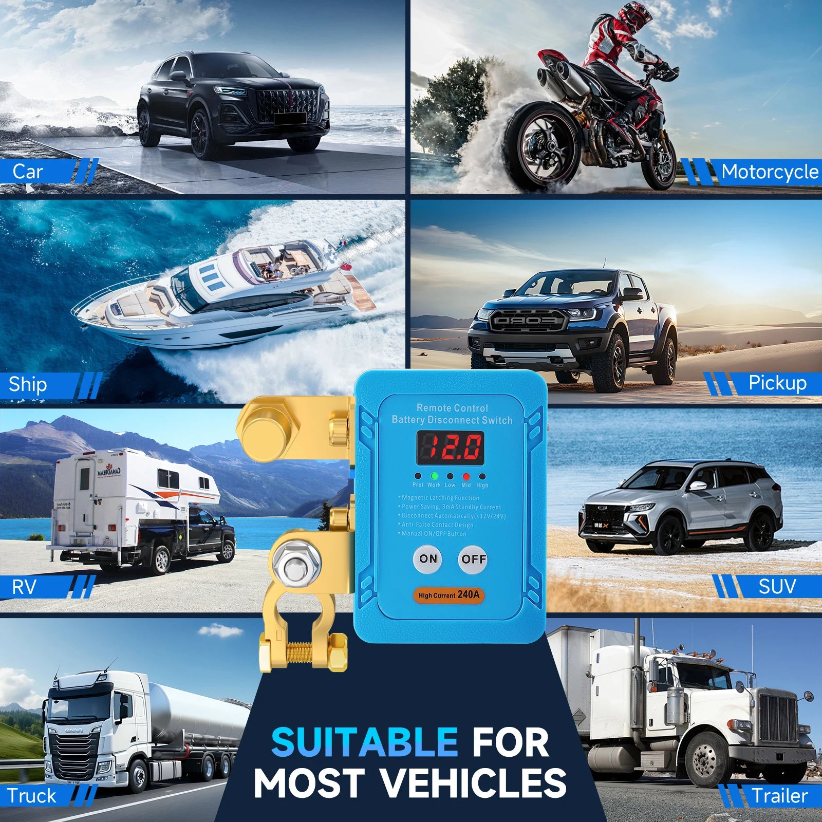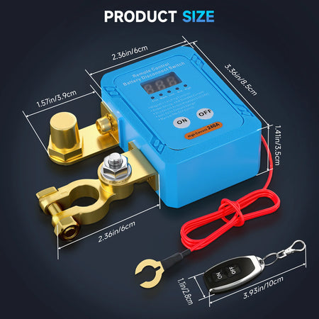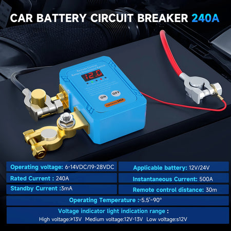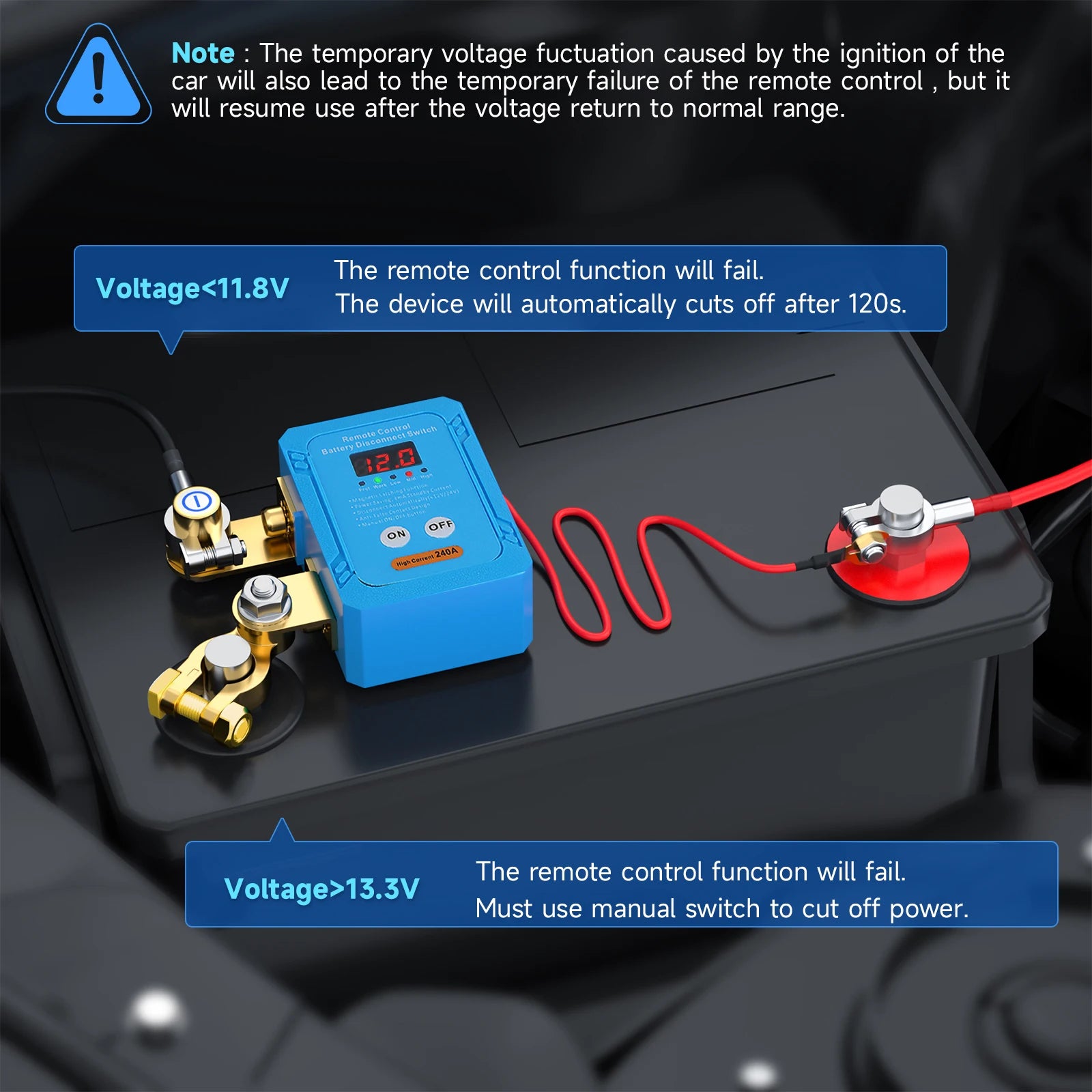 Ovaj 12V prekidač za isključivanje glavne baterije isporučuje do 240A snage prebacivanja dok radi na niskoj struji u stanju pripravnosti od 3mA. Automatski se isključuje kada napon baterije padne na 11.9V ±0.2V kako bi se spriječilo parazitsko pražnjenje i produžio vijek trajanja baterije. Za sigurnost tijekom vožnje, ako napon poraste iznad 13.2V, daljinski upravljač se onemogućuje, a svjetlo zaštite na ploči se pali kako bi se spriječilo slučajno isključivanje. Dva bežična daljinska upravljača omogućuju vam izolaciju ili vraćanje napajanja na daljinu—savršeno za brze sigurnosne provjere, parkirana vozila ili održavanje bez puzanja ispod haube.