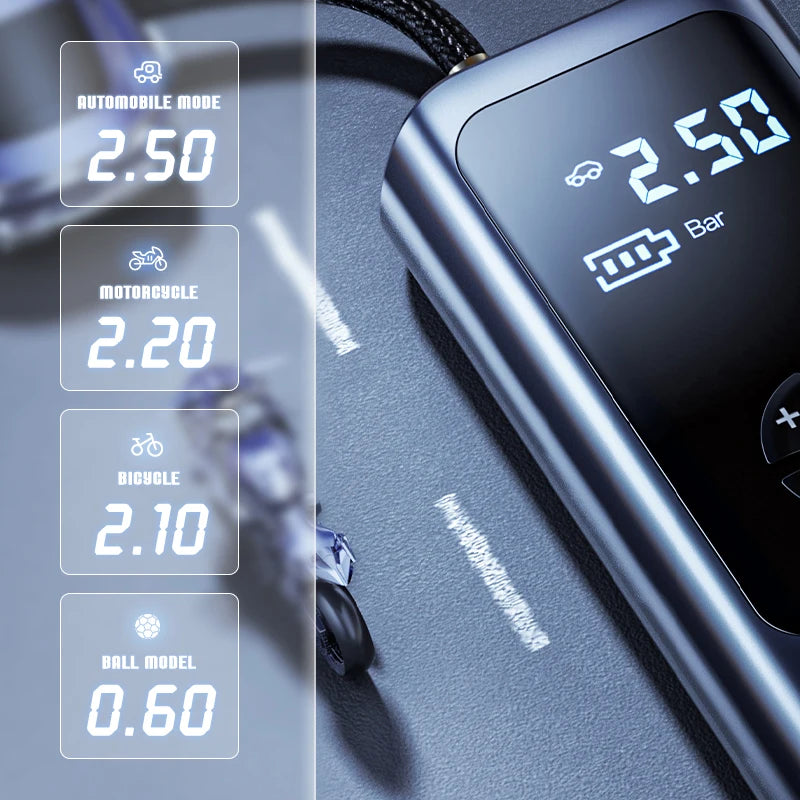 - Napuhujte s povjerenjem: točno mjerenje pritiska i automatsko isključivanje sprječavaju pod- ili prekomjerno napuhavanje, štiteći gume i opremu.